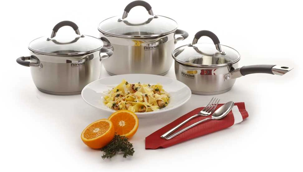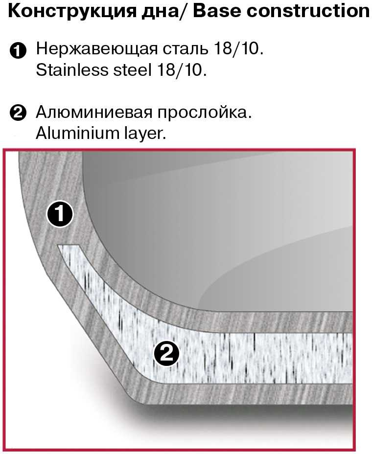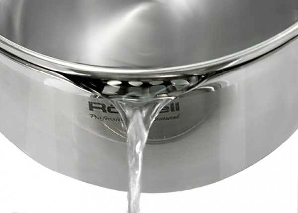 Технология: тройное вштампованное, а затем вплавленное дно без воздушных полостей. Аксессуары: удобные комбинированные: нержавеющая сталь и силикон. Преимущества: комбинированная крышка из термостойкого стекла с ободком из нержавеющей стали для удобного слива жидкости (2 диаметра отверстий).