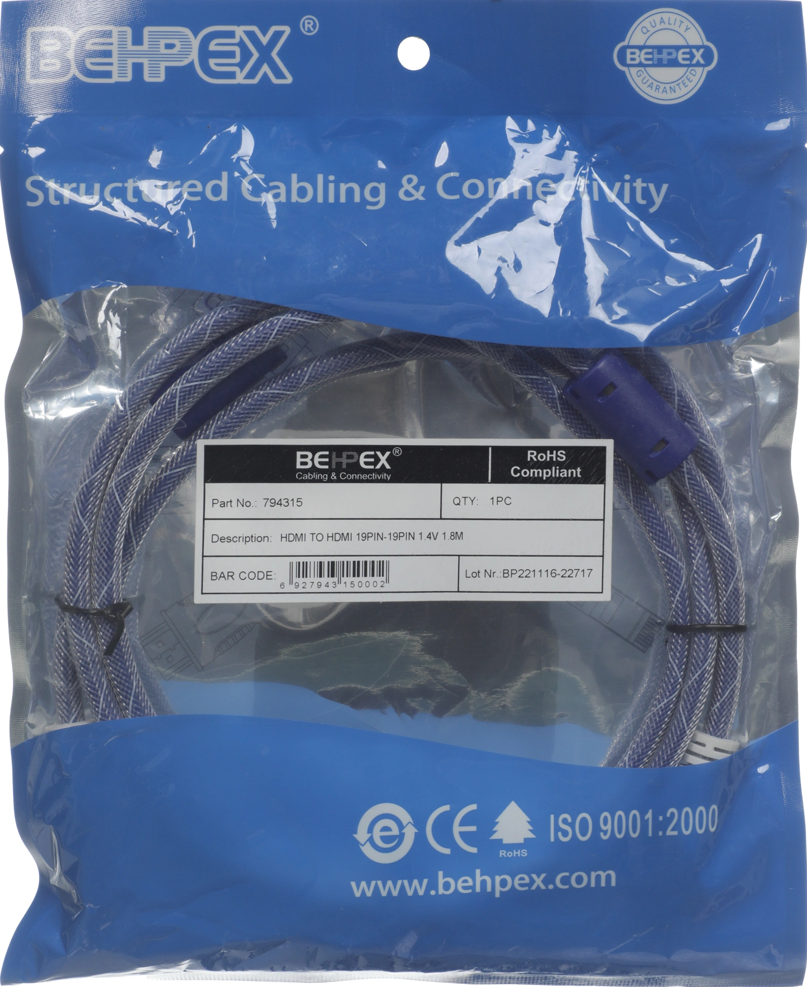 Кабель аудио-видео HDMI (m)/HDMI (m) 1.8м. феррит.кольца позолоч.конт. синий/белый
