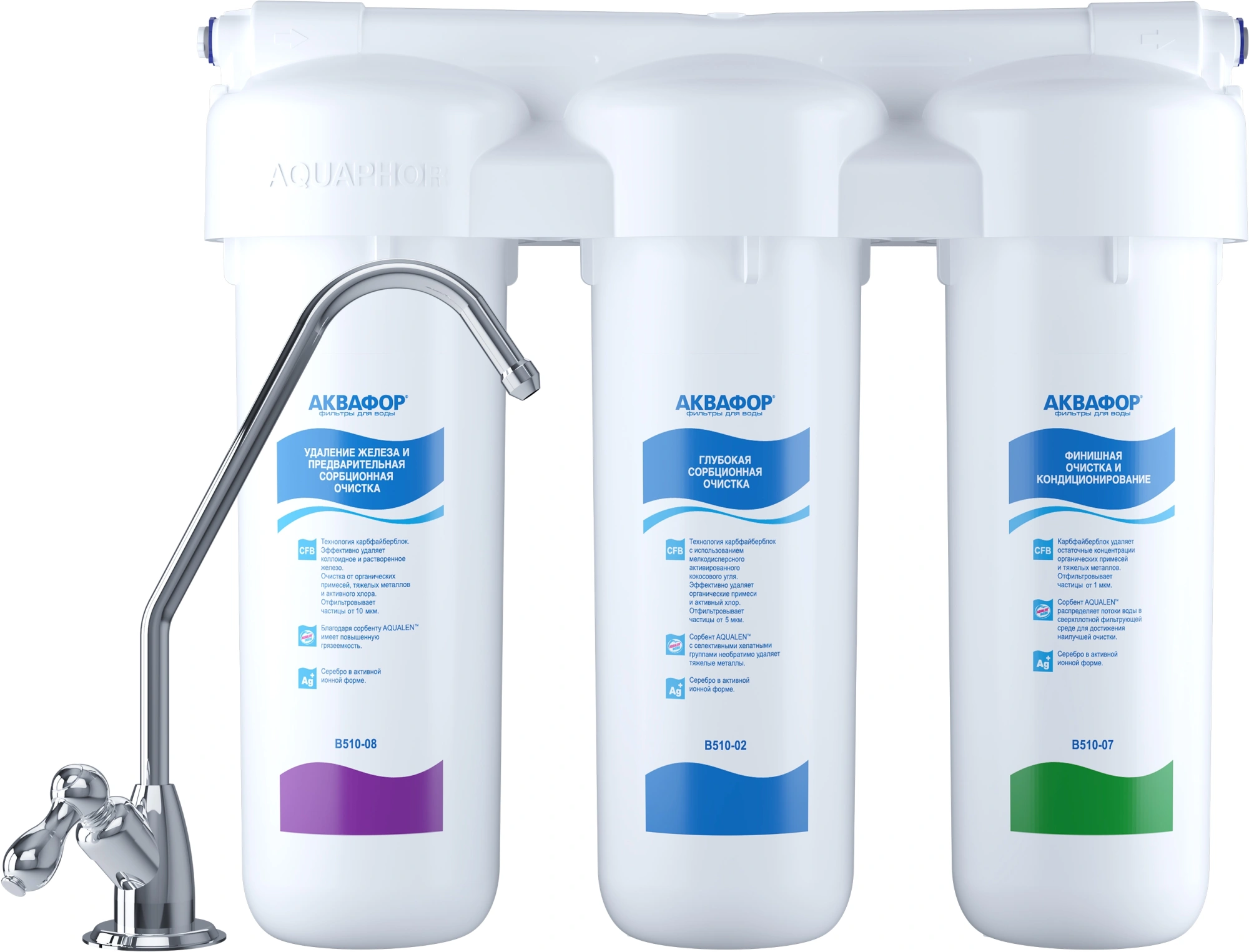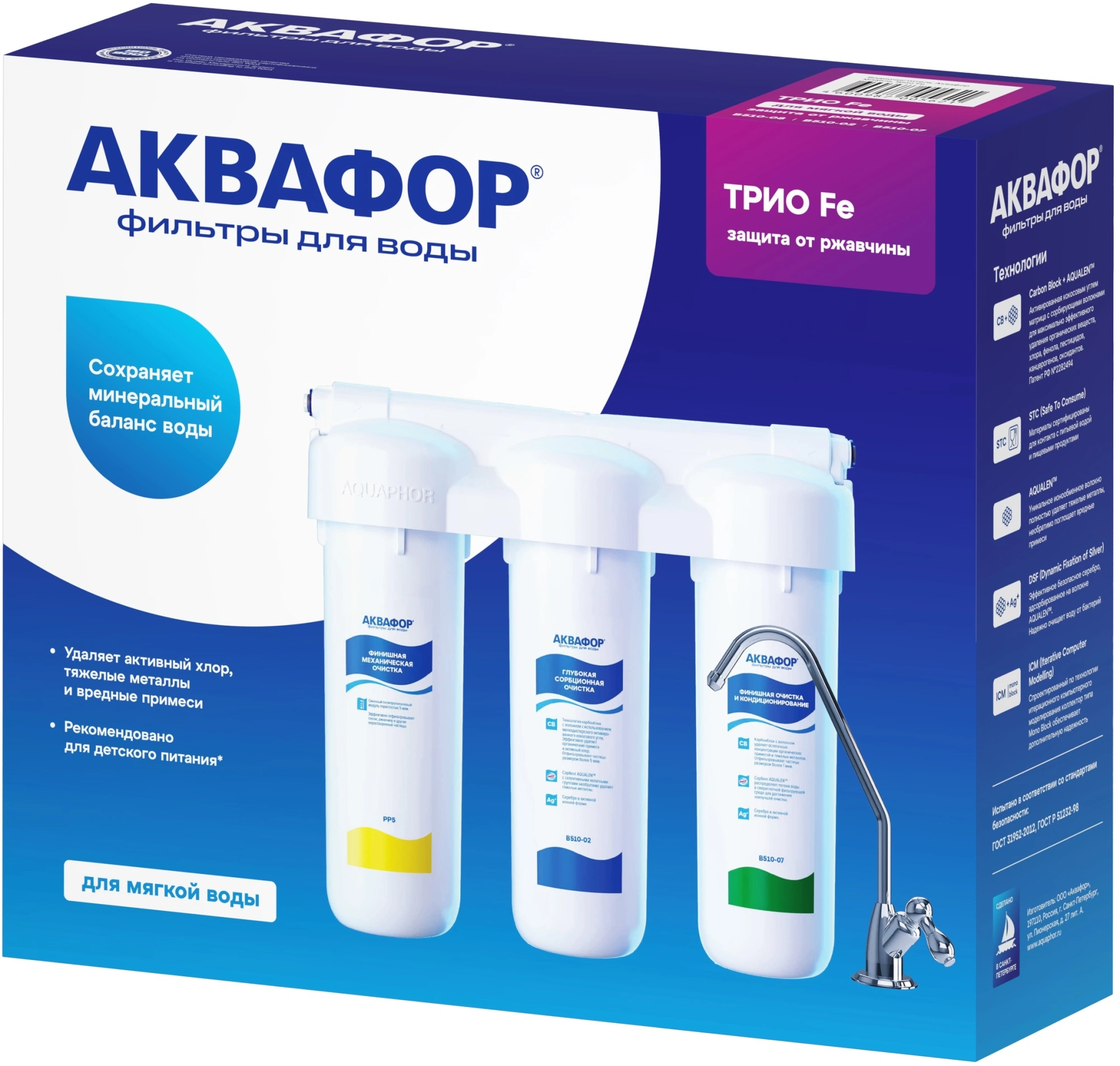Аквафор Трио Fe - инновационный фильтр для очистки воды от ржавчины при высоком уровне загрязнения. Благодаря особенностям конструкции и оптимальному соотношению сорбентов он надежно удаляет коллоидное железо, активный хлор, нефтепродукты, фенол, свинец, кадмий и другие ионы тяжелых металлов.