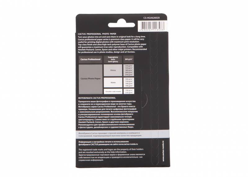 Суперглянцевая фотобумага Cactus серии Professional для струйной печати – бумага премиального качества. Благодаря своему особому покрытию обладает бо́льшим блеском и гладкостью, что позволяет получить более яркие фотографии, чем при печати на стандартной глянцевой бумаге. Идеально подходит в тех случаях, когда Вам требуется получить максимально насыщенные цветом снимки: для высококачественной фотопечати, в том числе в домашних условиях, а также для огромного спектра задач, требующих изображений высокого качества.