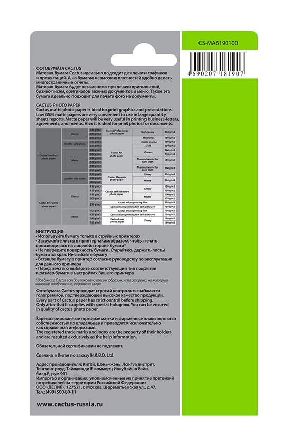 10x15/190г/м2/белый/100л. матовое для струйной печ...