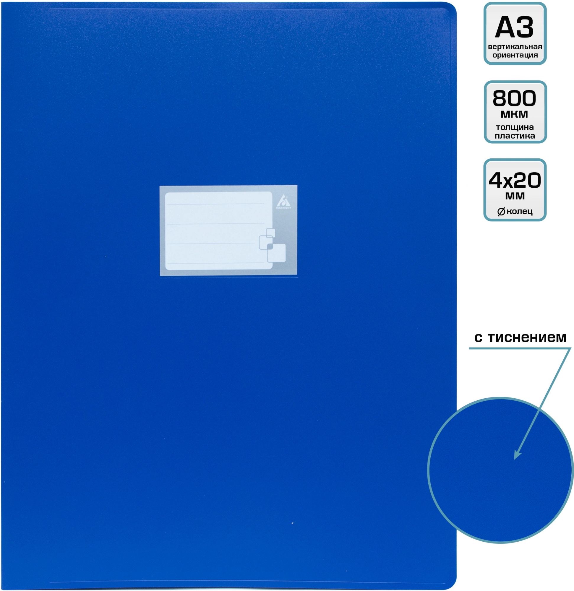 Папка на 4-х кольцах Бюрократ -0827VA3BLU A3 верт. пластик 0.8мм кор.27мм синий