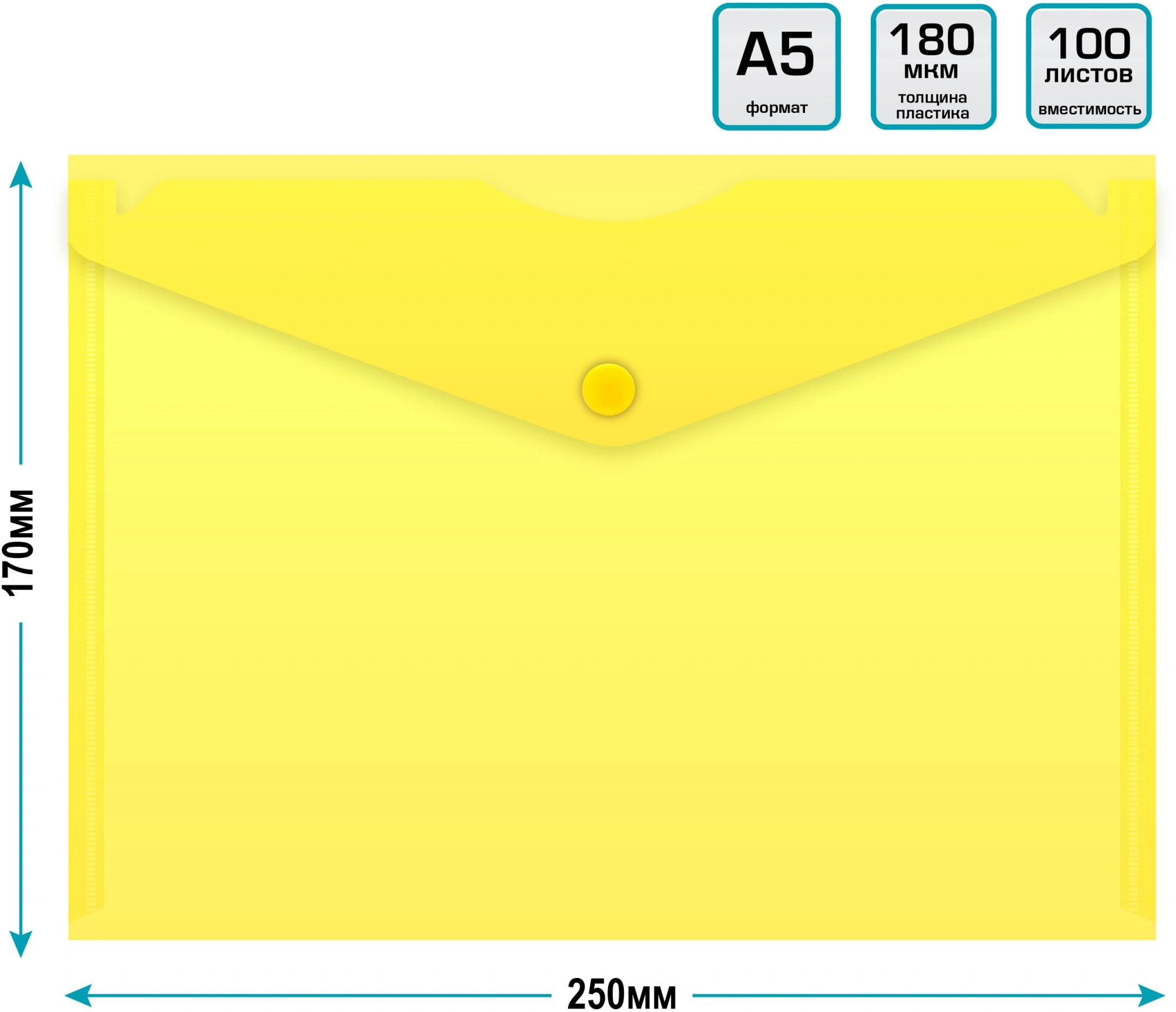 Конверт с кнопкой(однотонный),ф.А5, толщина 0.18мм,желтый,Россия