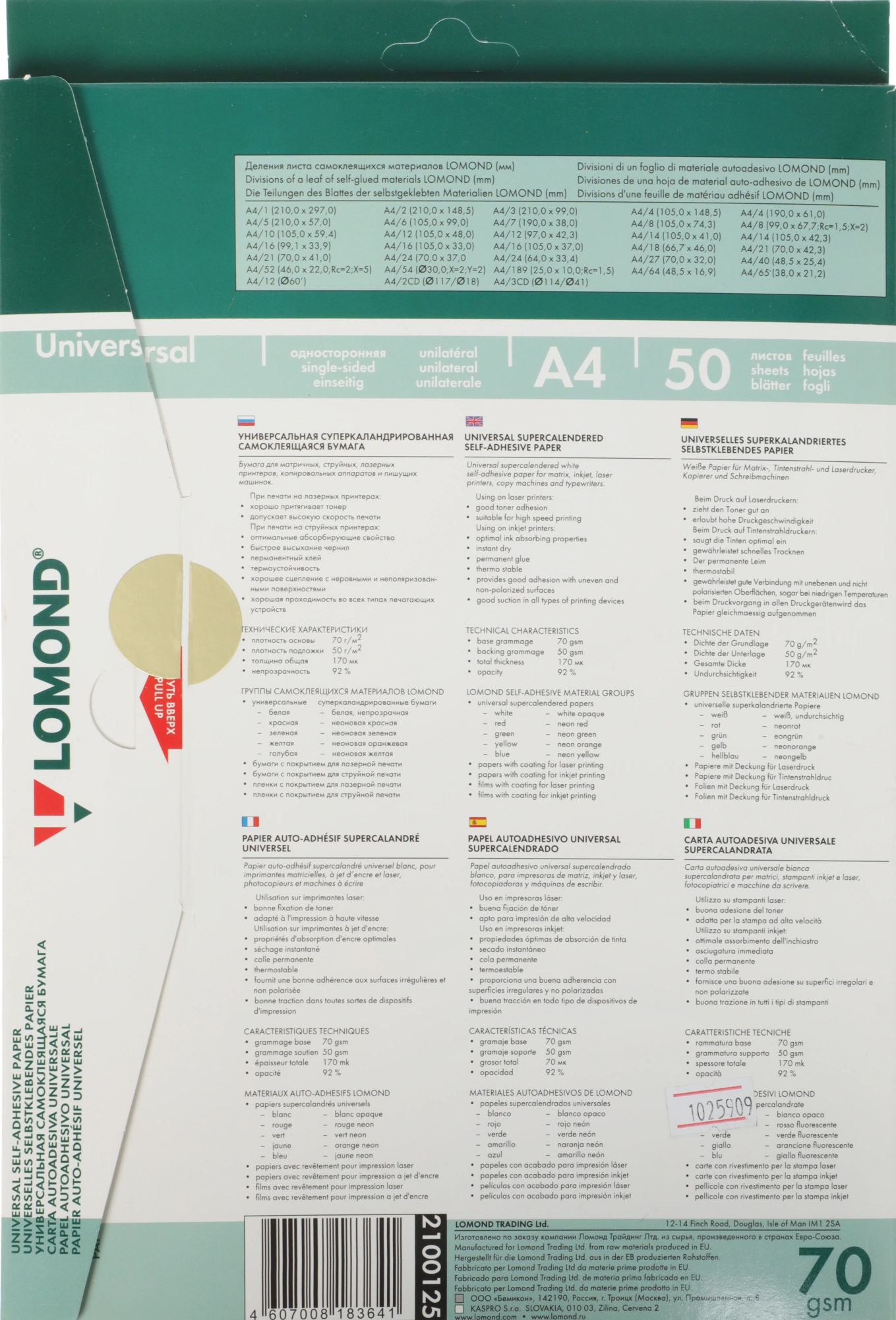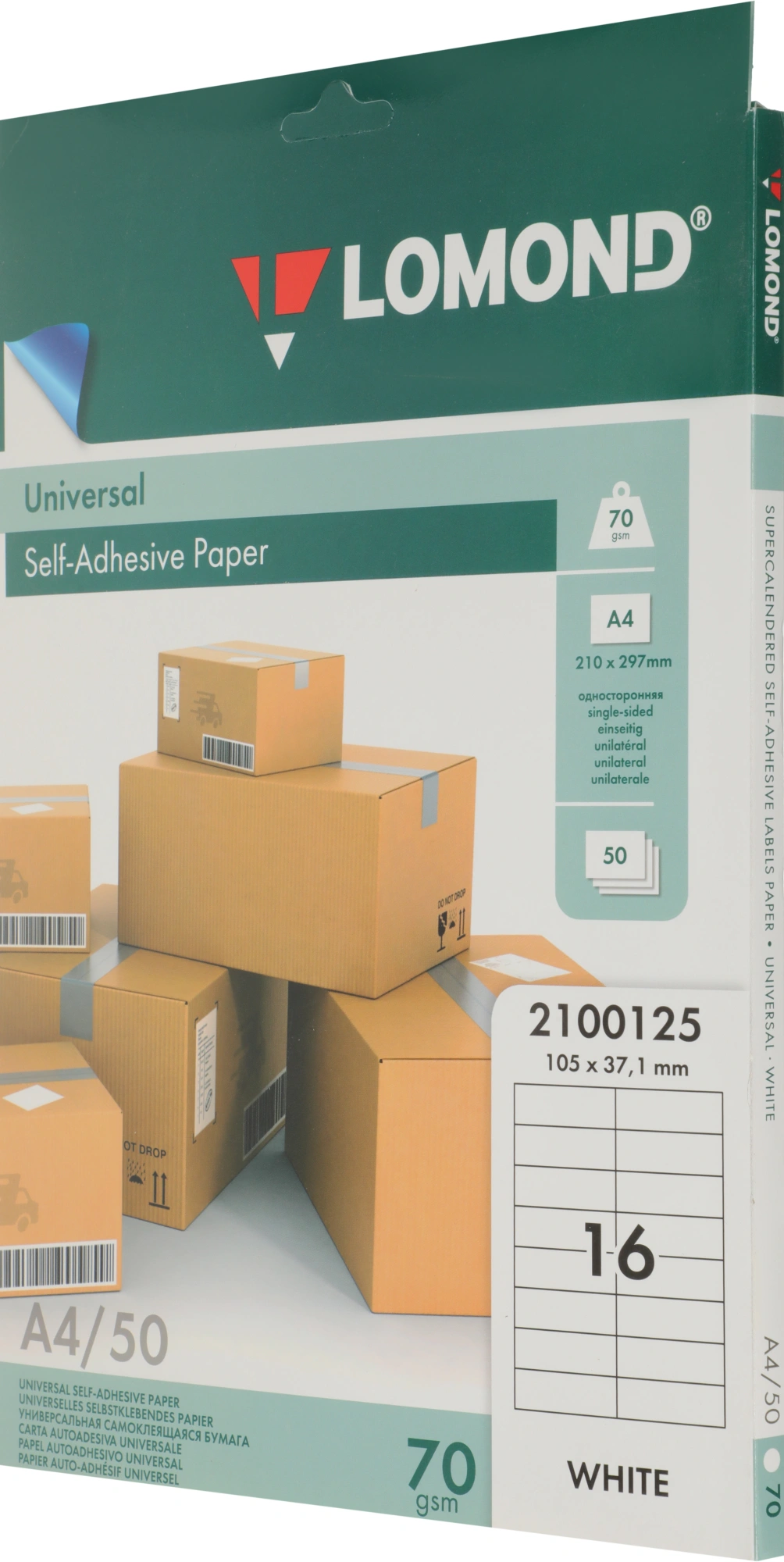 Универсальная самоклеящаяся бумага Lomond предназначена для изготовления разнообразных лэйблов, этикеток и т.п., которые используются как наклейки на почтовую корреспонденцию, товарные упаковки и любые другие изделия. Бумага разработана для печати в копировальных аппаратах и различных типах принтеров, включая струйные и лазерные. Хорошо притягивает тонер, отличается идеальной проходимостью во всех типах принтеров. Универсальная самоклеящаяся бумага Lomond имеет не расплывающуюся, термоустойчивую клеевую основу, ровную поверхность, обеспечивает хорошее сцепление с неровными, неполяризованными поверхностями даже при низких температурах.
