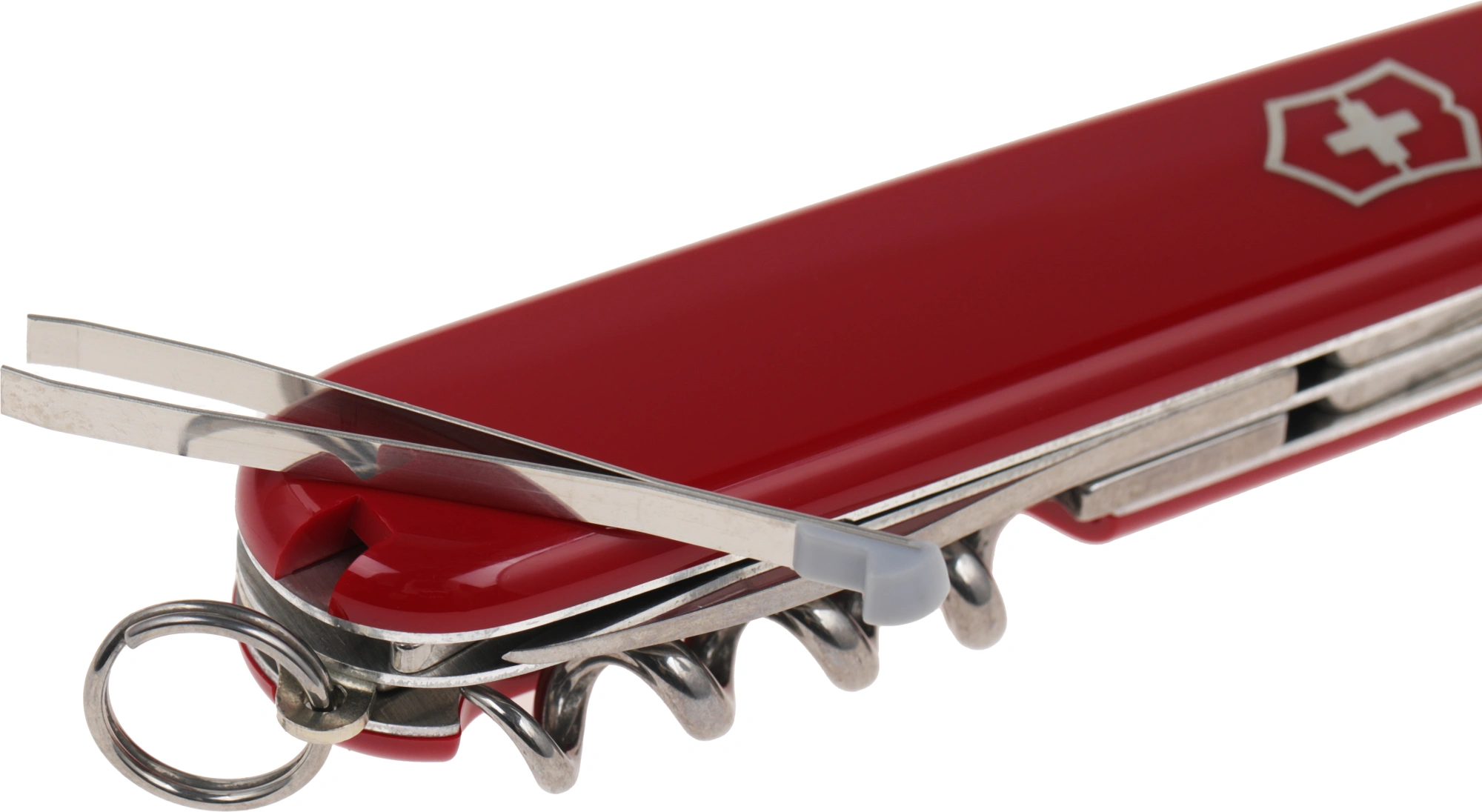 большой клинок, открывалка для консервных банок /маленькая плоская отвертка, открывалка для бутылок /плоская отвертка /паз для снятия изоляции, пилка для ногтей /инструмент для чистки ногтей, штопор, шило с ушком /кернер, зубочистка, пинцет