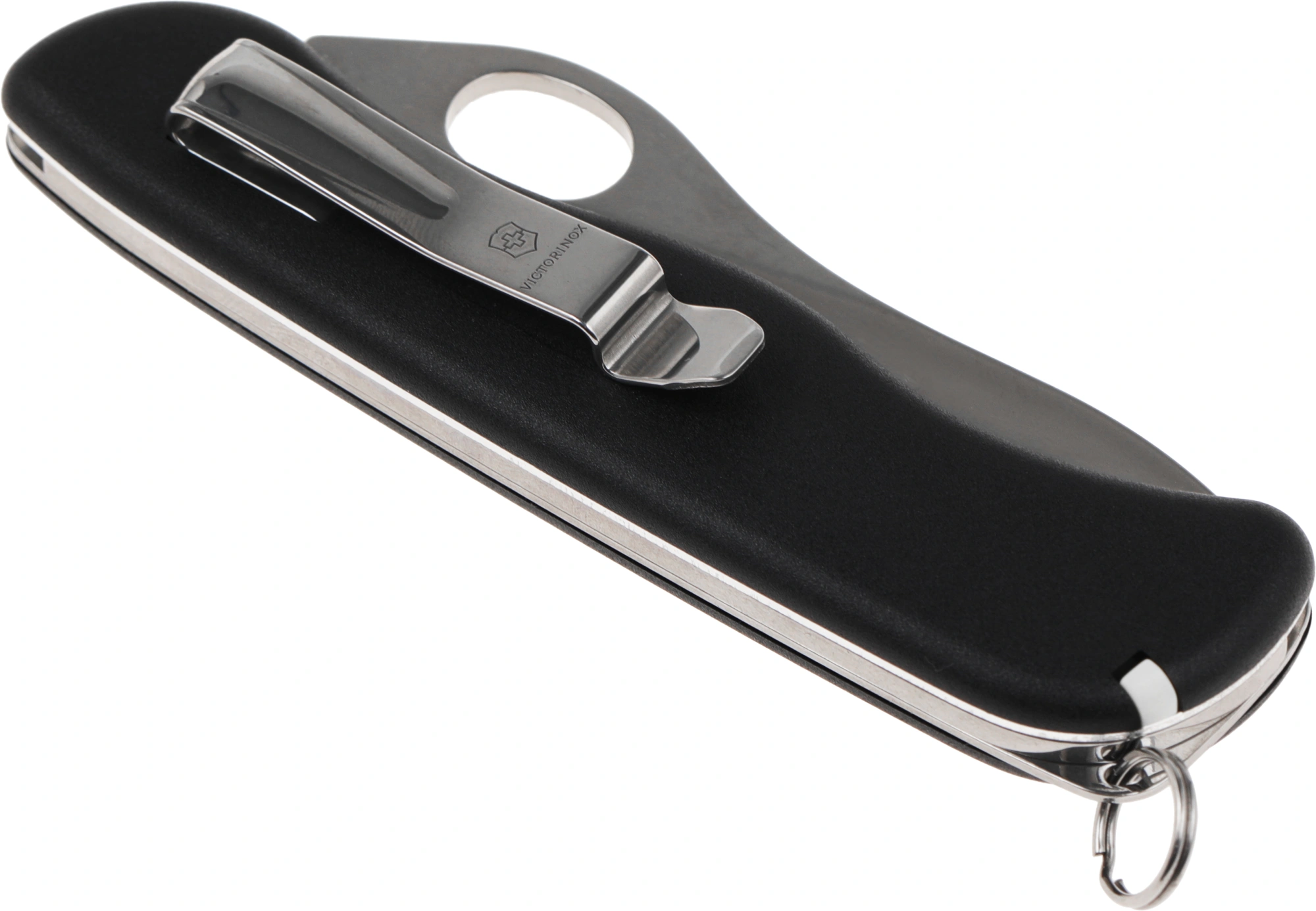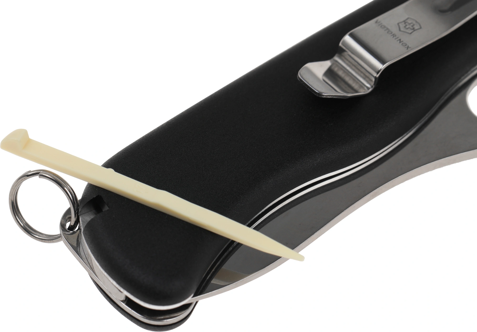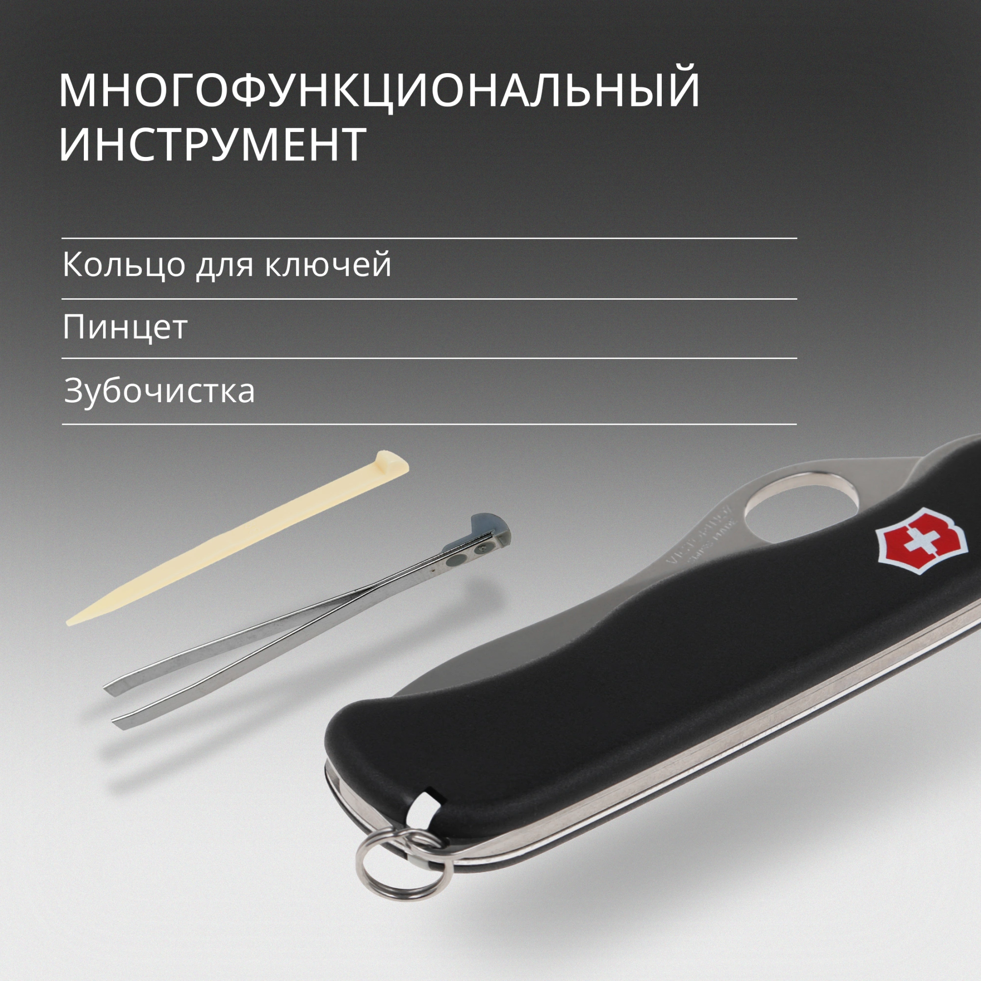 большое фиксирующееся лезвие с возможностью открывания одной рукой, кольцо для ключей, пинцет, зубочистка, крепление на ремень
