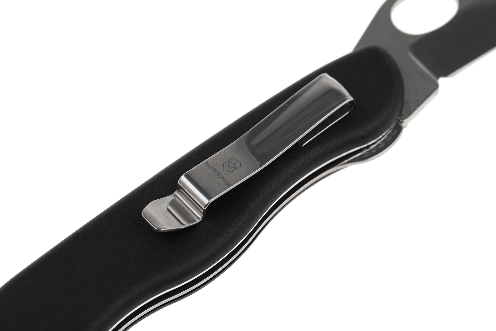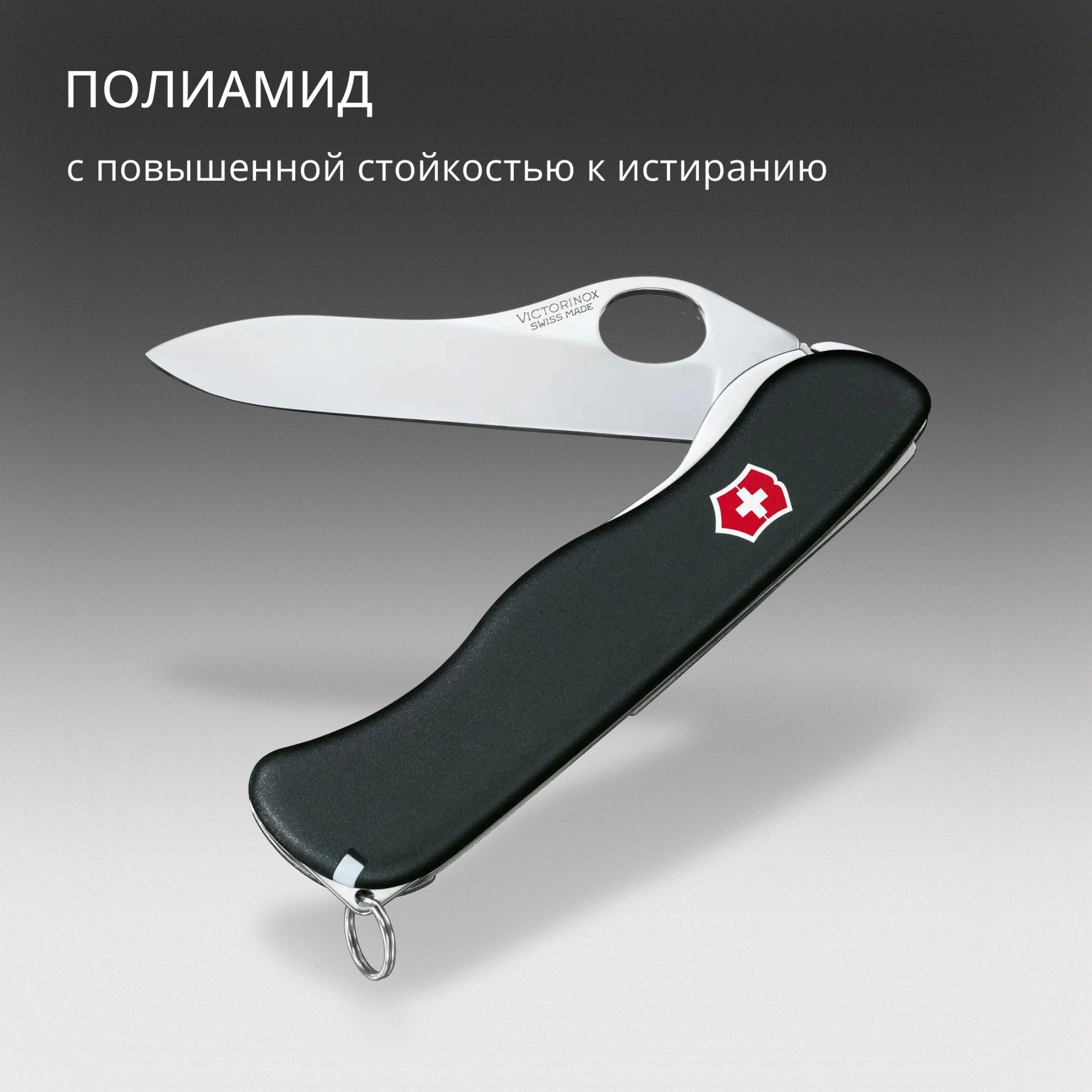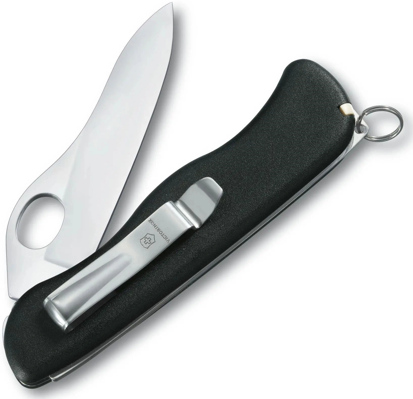 большое фиксирующееся лезвие с возможностью открывания одной рукой, кольцо для ключей, пинцет, зубочистка, крепление на ремень
