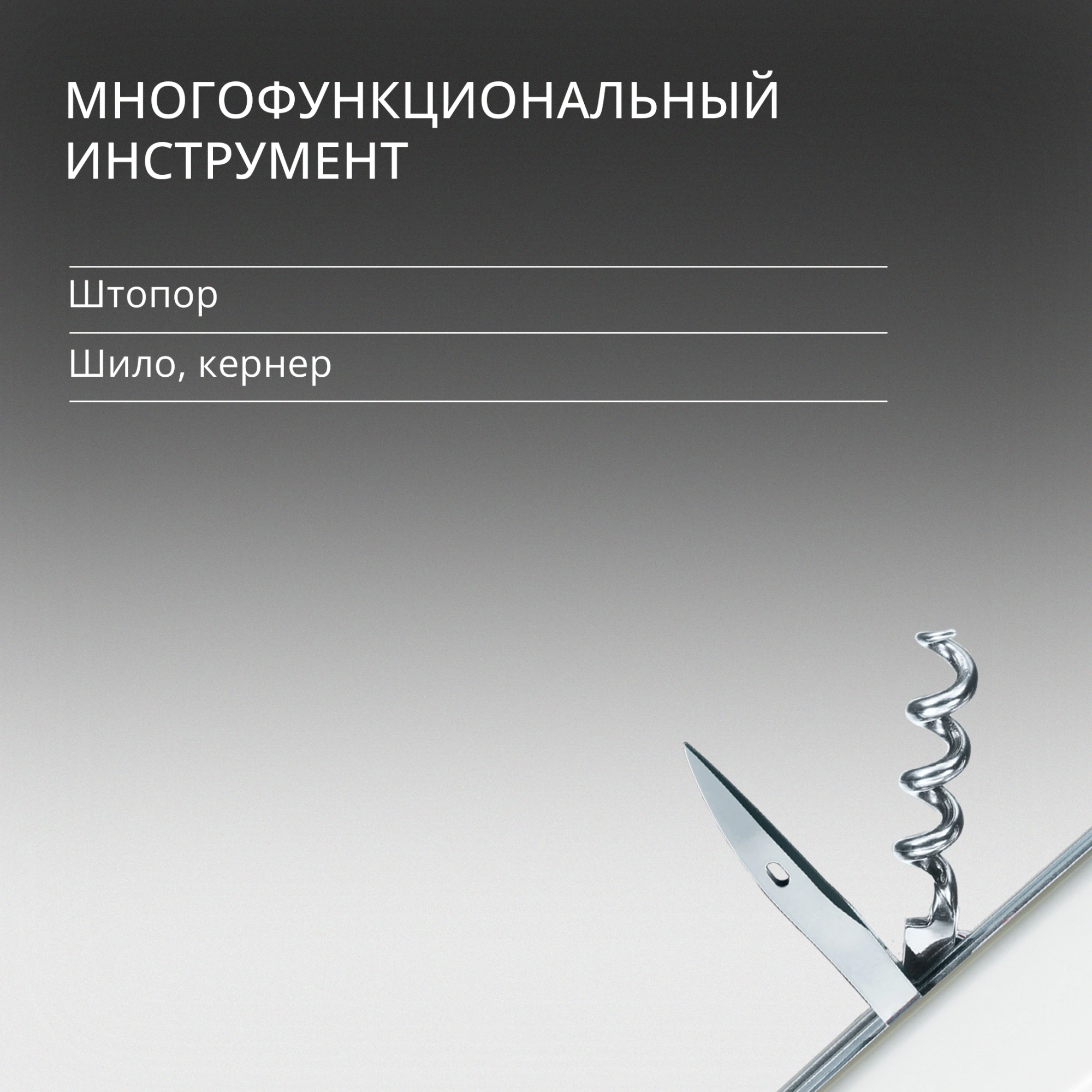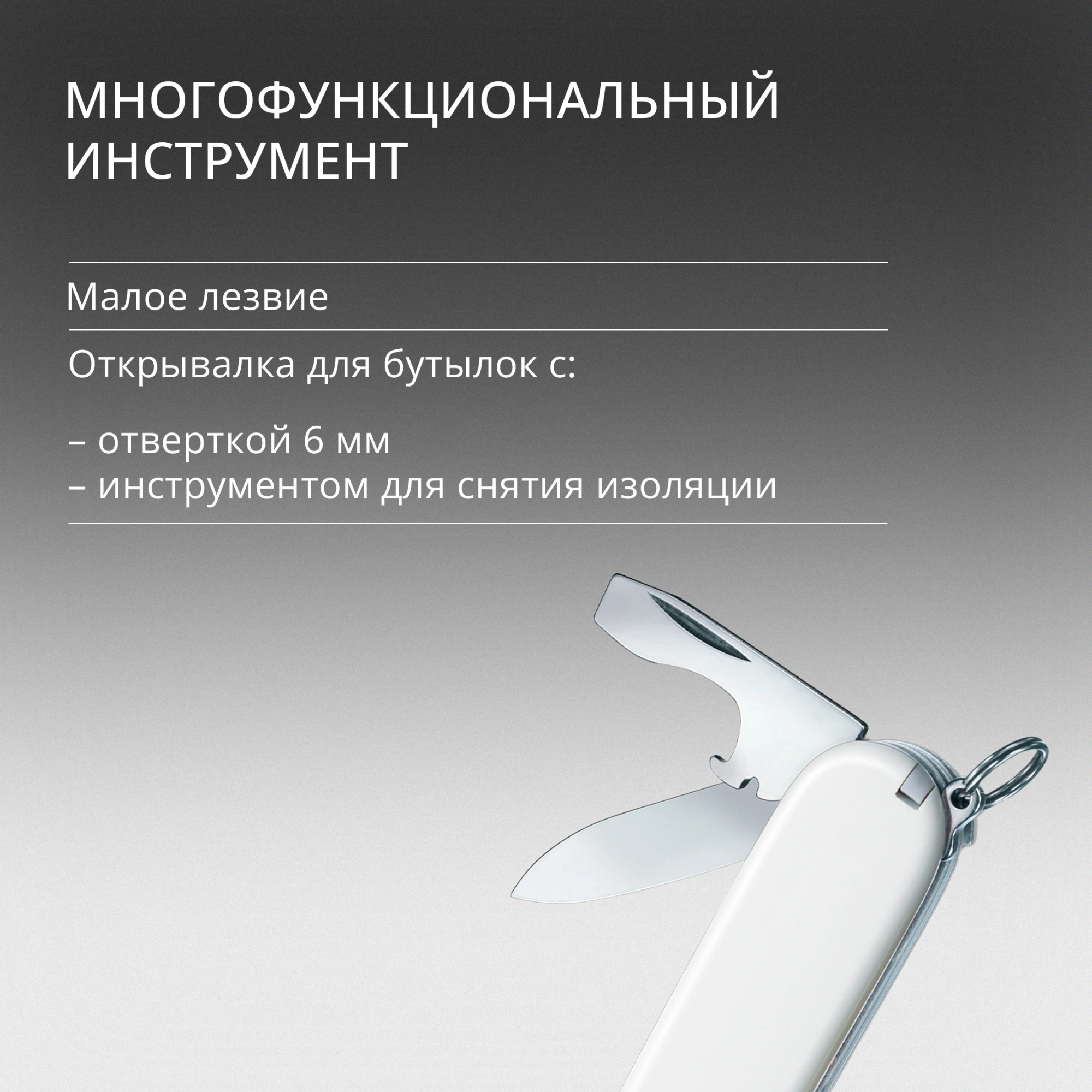 большое лезвие, малое лезвие, штопор, консервный нож с малой отверткой, открывалка с отверткой -инструментом для снятия изоляции, шило, кернер, кольцо для ключей, пинцет, зубочистка