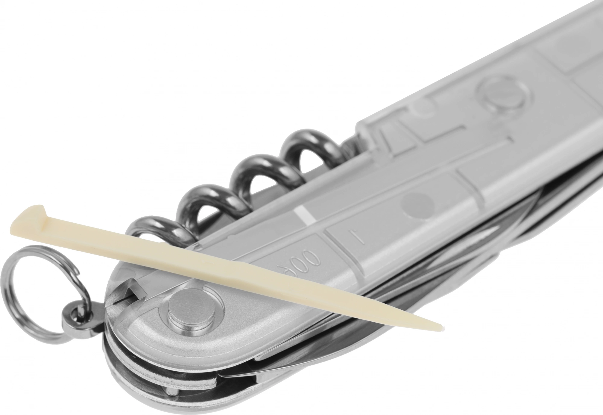 1.Большое лезвие. 2.Малое лезвие. 3.Штопор. 4.Консервный нож с: 5. - Малой отверткой (также для винта с крестообразным шлицем). 6.Открывалка для бутылок с: 7.- Отверткой. 8.+ Инструментом для снятия изоляции. 9.Шило, кернер. 10.Кольцо для ключей. 11.Пинцет. 12.Зубочистка