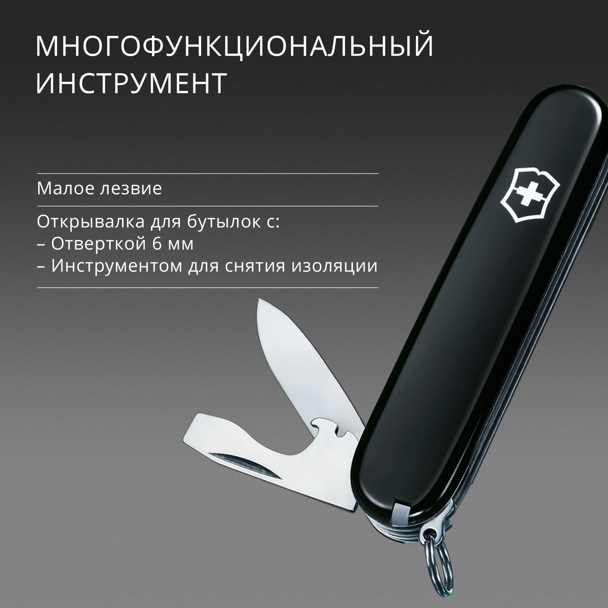 Нержавеющая сталь.Большое лезвие, малое лезвие, штопор, консервный нож с малой отверткой (также для винта с крестообразным шлицем), открывалка для бутылок с отверткой и инструментом для снятия изоляции, шило, кернер, кольцо для ключей, пинцет, зубочистка, ножницы, многофункциональный крючок.