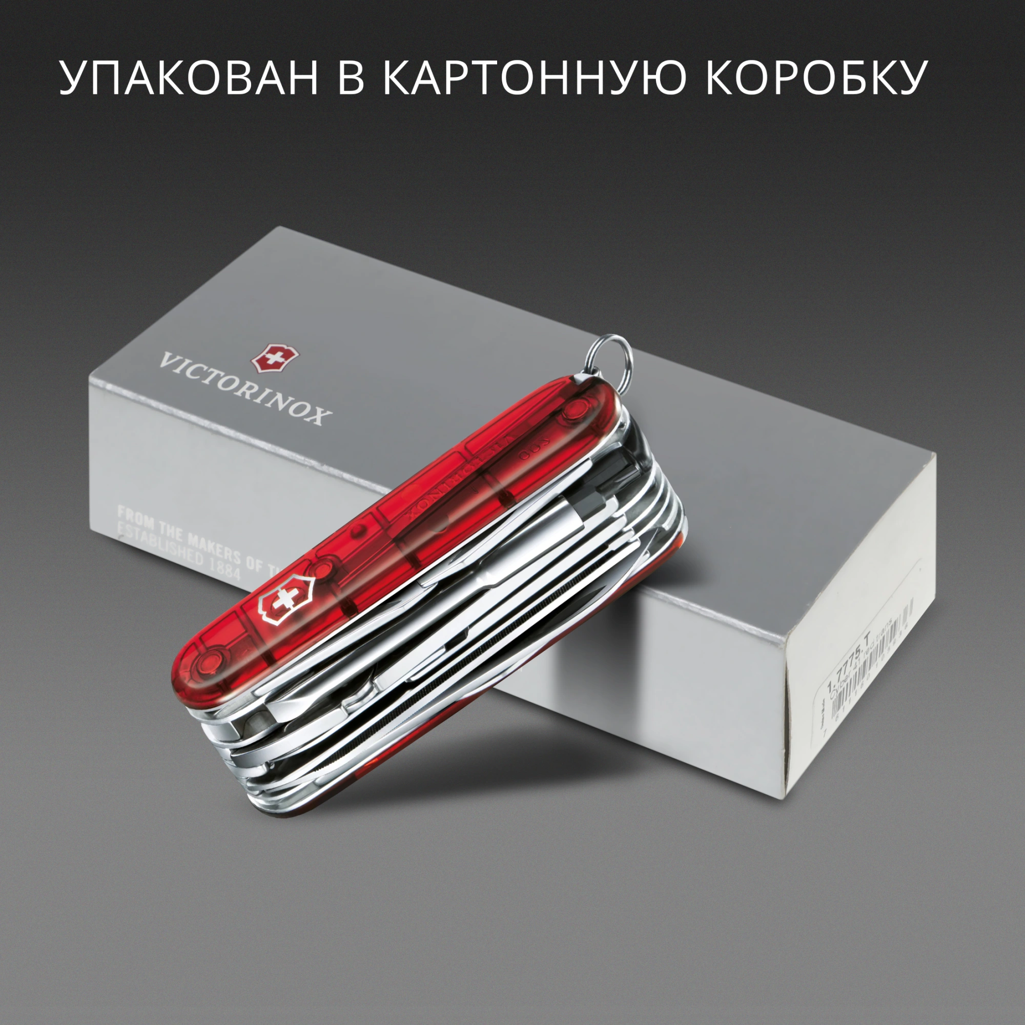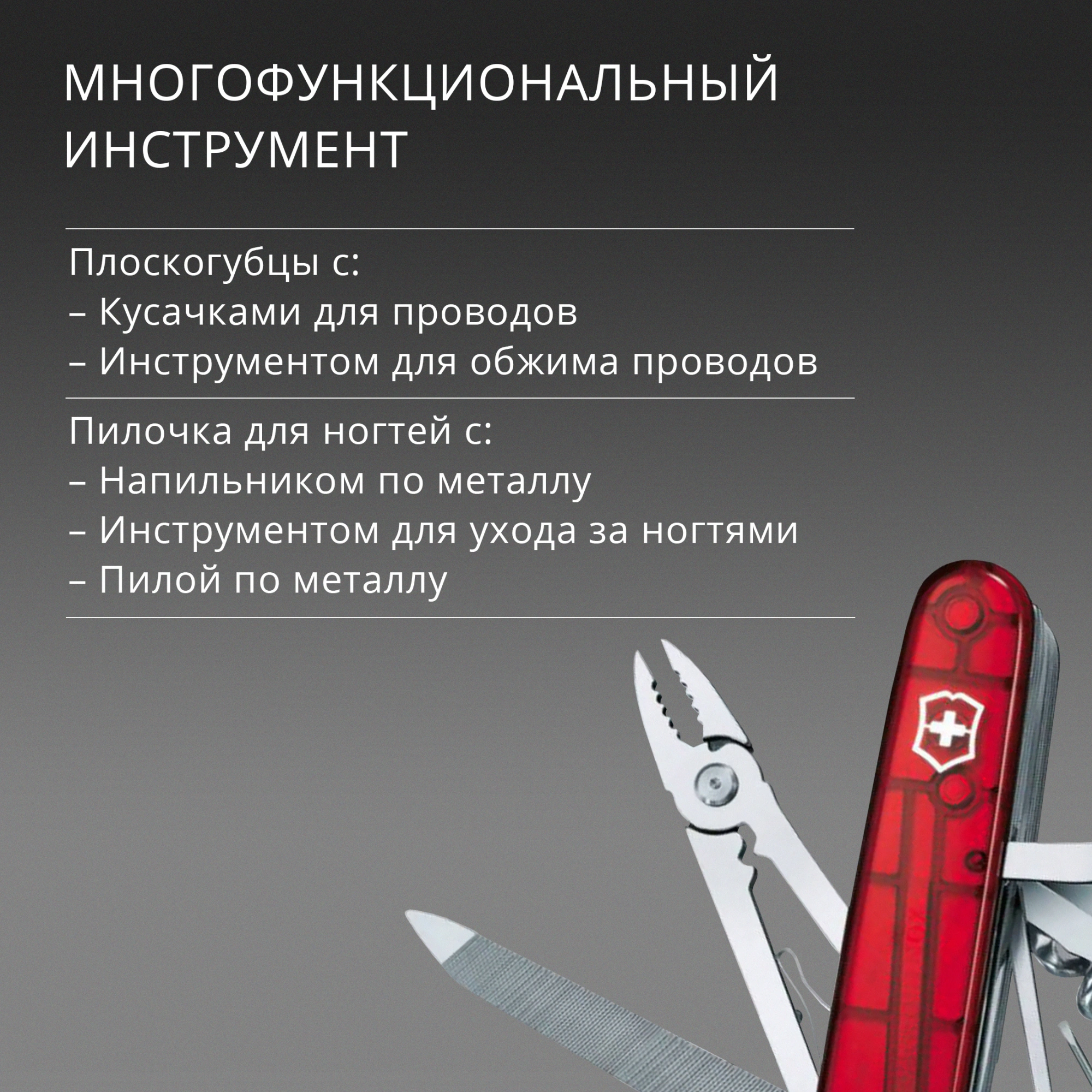 Складной швейцарский нож Victorinox CyberTool 41 - это многофункциональный инструмент (мультитул) с прозрачной красной рукоятью; помещается в кармане, содержит 30 элеметов и выполняет 41 функцию.