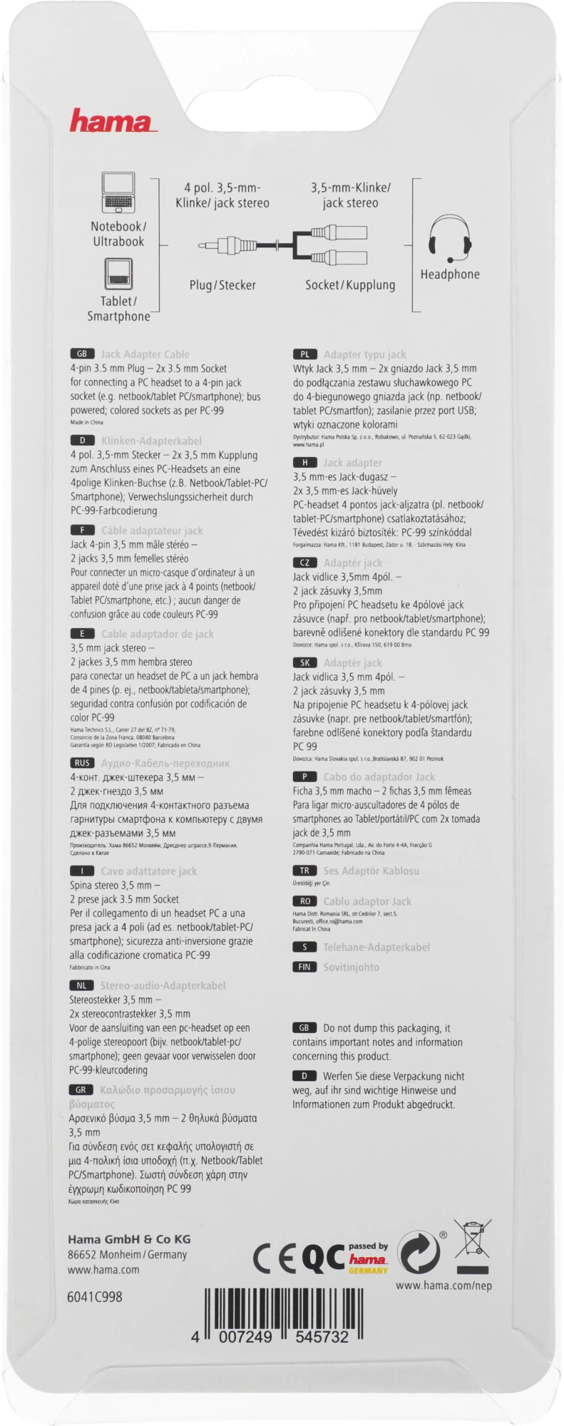 Тип соединения: 2x3.5 мм Jack (f) - 4 pin 3.5 мм Jack (m)