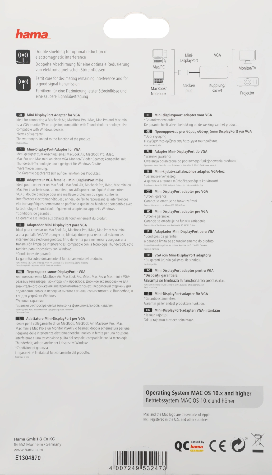 Идеально подходит для подключения MacBook Air, MacBook Pro, iMac, Mac Pro and Mac mini к VGA монитору / телевизору или проектору.