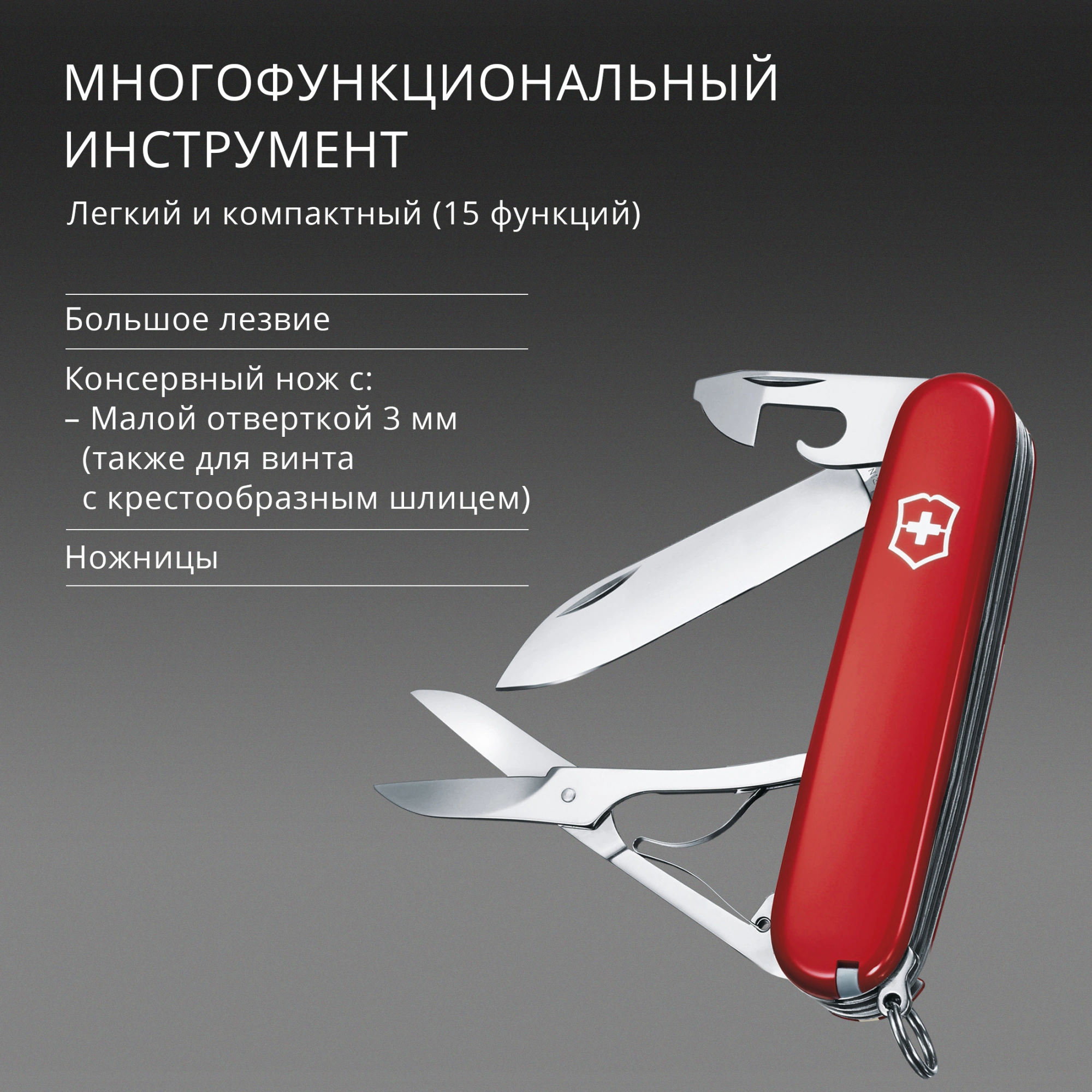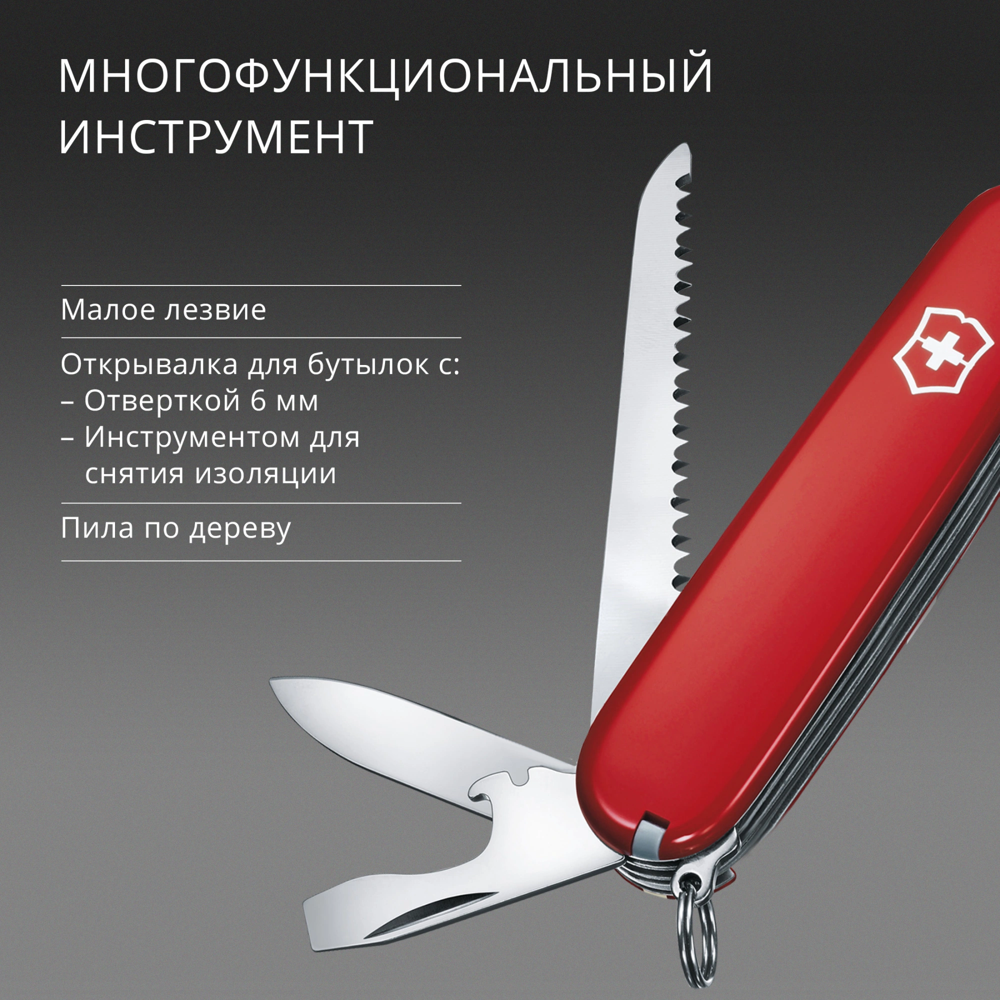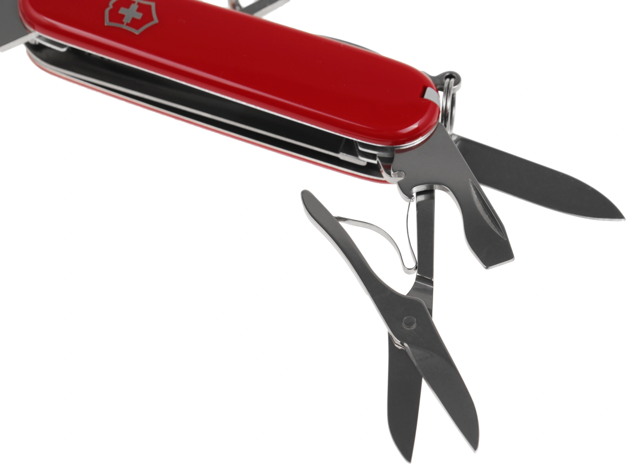 Большое лезвие, малое лезвие, штопор, консервный нож с малой отверткой (также для винта с крестообразным шлицем), открывалка для бутылок с отверткой и инструментом для снятия изоляции, шило, кернер, кольцо для ключей, пинцет, зубочистка, ножницы, многофункциональный крючок, пила по дереву.