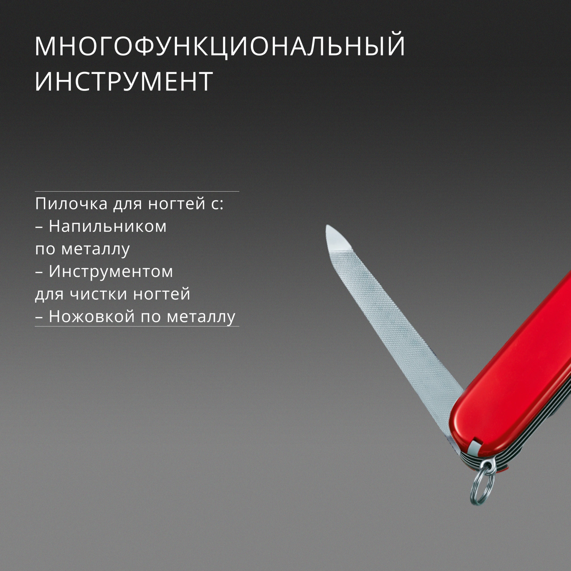 Нож, малый нож, пила, стамеска, напильник, ножовка по металлу, консервный нож, штопор, открывалка, 3 отвертки, сниматель изоляции, шило (кернер), кольцо для ключей, пинцет, зубочистка, ножницы, крючок, пилка для ногтей, инструмент для чистки ногтей.