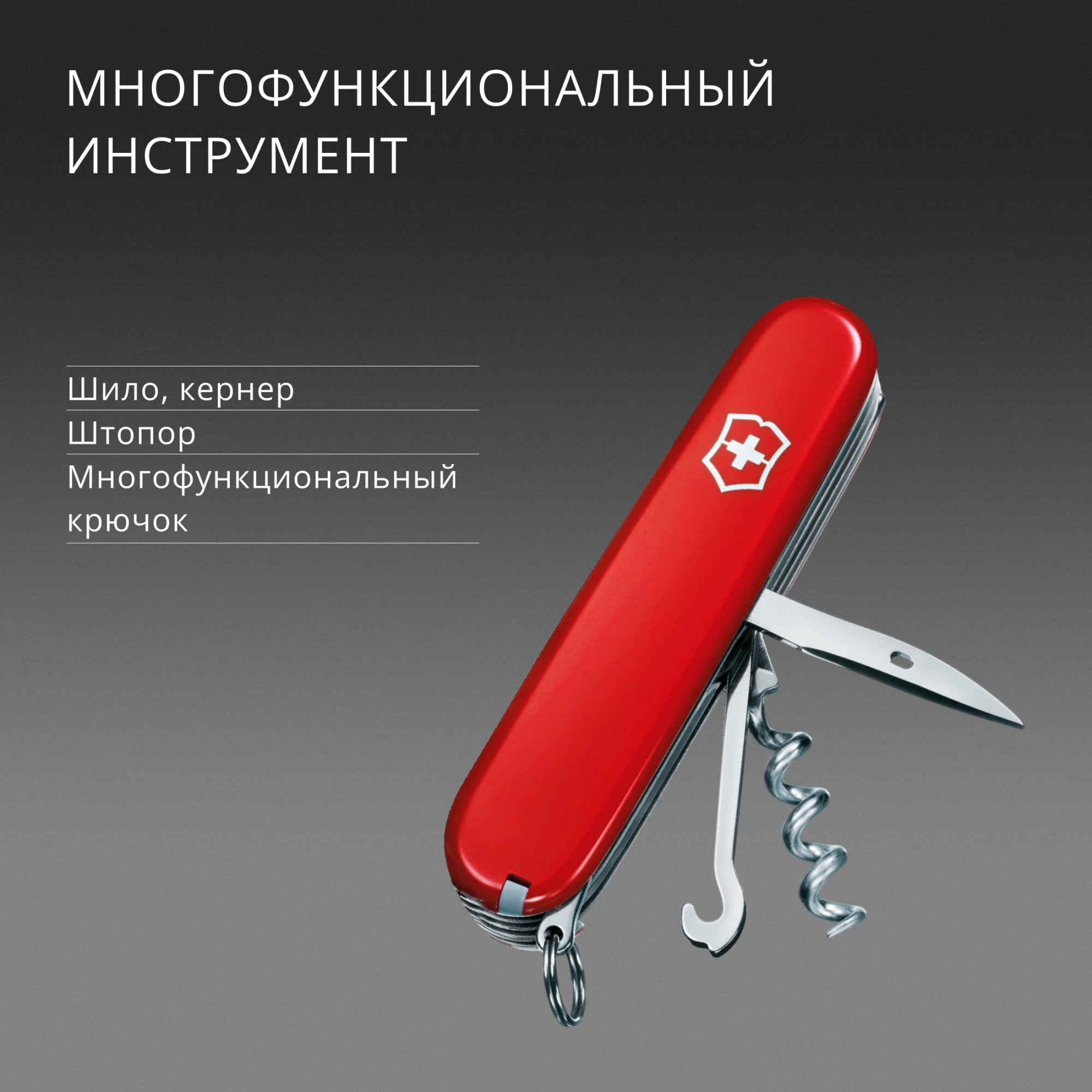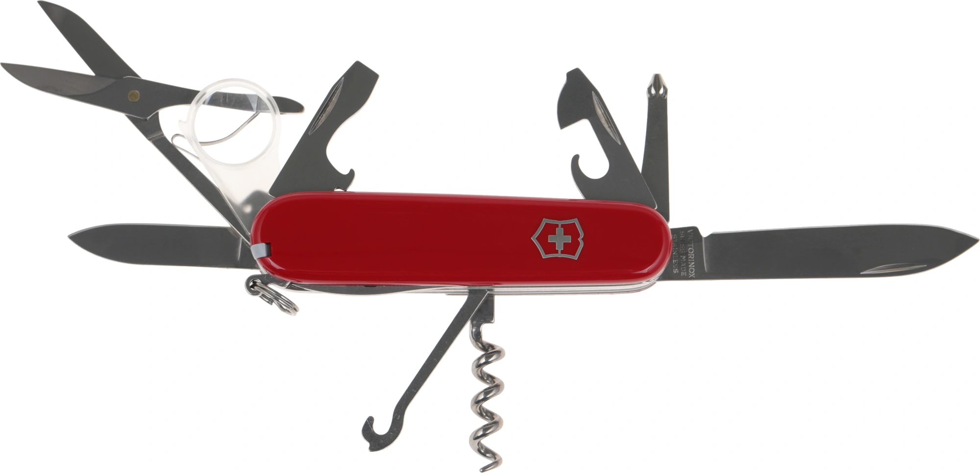 Нож, малый нож, консервный нож, открывалка, штопор, 3 отвертки, сниматель изоляции, шило(кернер), пинцет, кольцо для ключей, крючок, ножницы, лупа 8х, зубочистка.