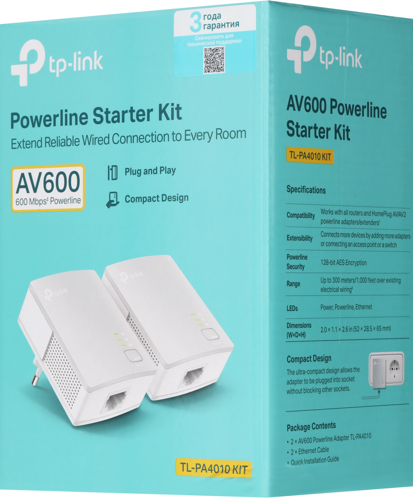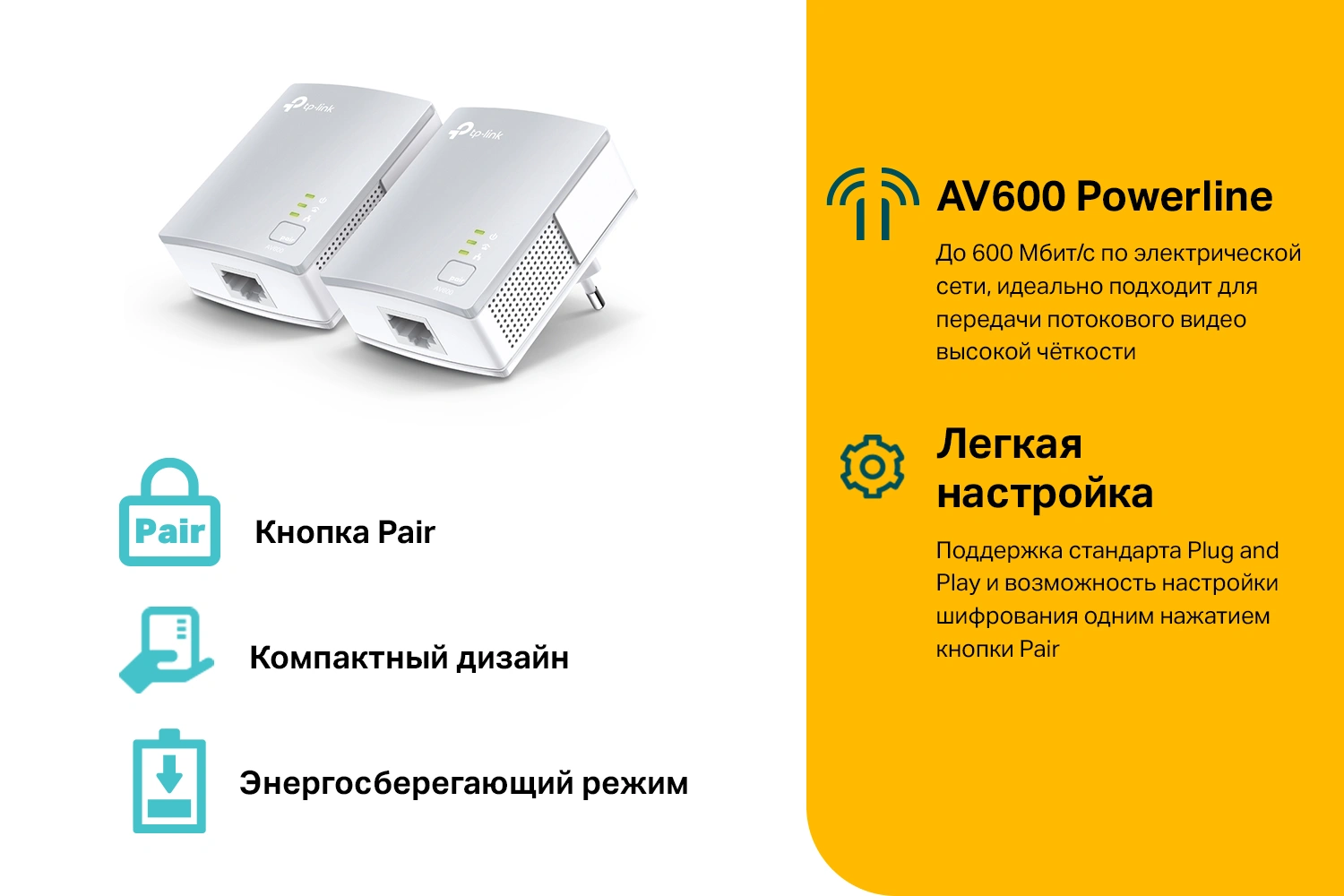 600 Мбит/с, 1 порт Ethernet 10/100 Мбит/с, кнопка Pair, передача данных по действующей электросети на расстоянии до 300 метров, запатентованный энергосберегающий режим, компактный дизайн, QoS