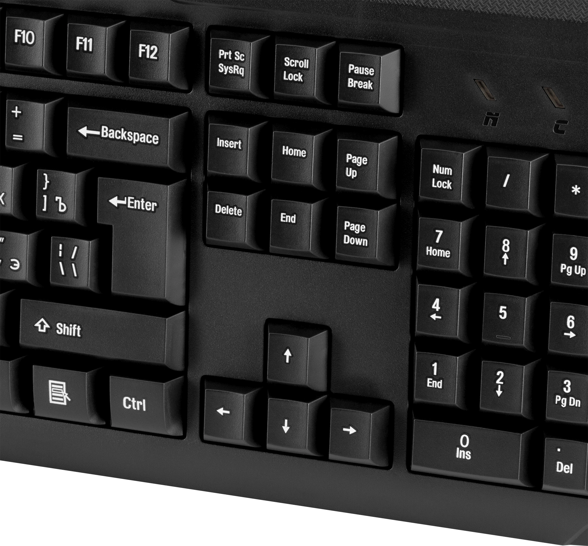 Классический дизайн в черном цвете делает клавиатуру идеальной для офиса, так как устройство выглядит строго и стильно. Клавиши – квадратные. Английские и русские буквы выделены белым цветом.