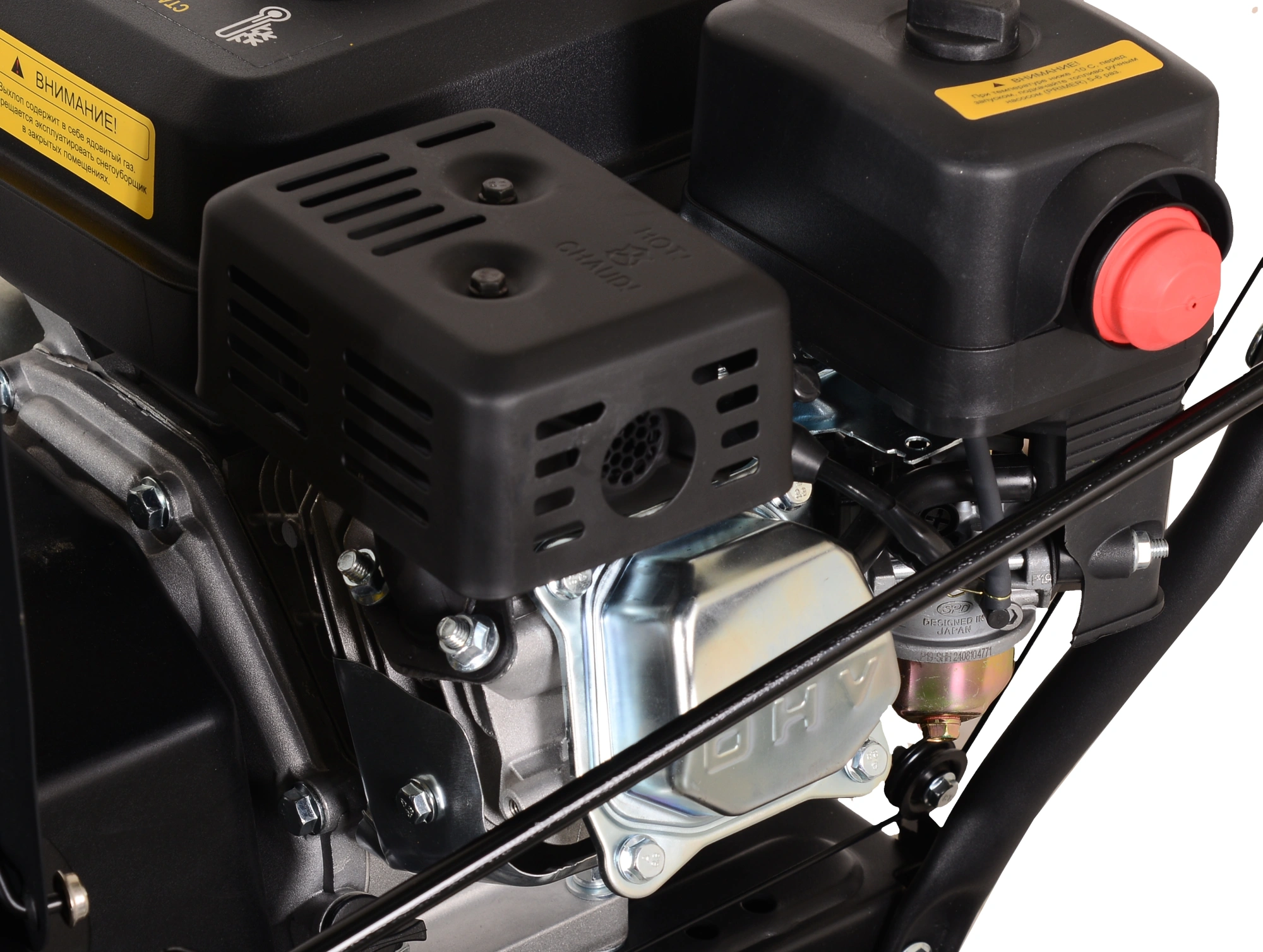 Двигатель адаптирован для работы при низких температурах. Снегоуборщик является самоходным. Регулировка направления выброса снега посредством рукоятки позволяет делать это быстро, практически на ходу. Срезаемые шплинты для защиты рабочих органов. Хромовое покрытие поршневой группы.