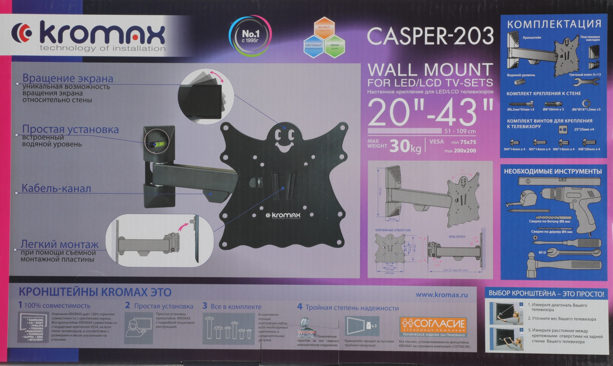 Наклонно-поворотный кронштейн для крепления к стене телевизоров и мониторов с не большой и средней диагональю экрана. Высококачественная стальная конструкция обеспечит надежное и безопасное использование. Легко снимающаяся монтажная пластина облегчит процесс уборки.