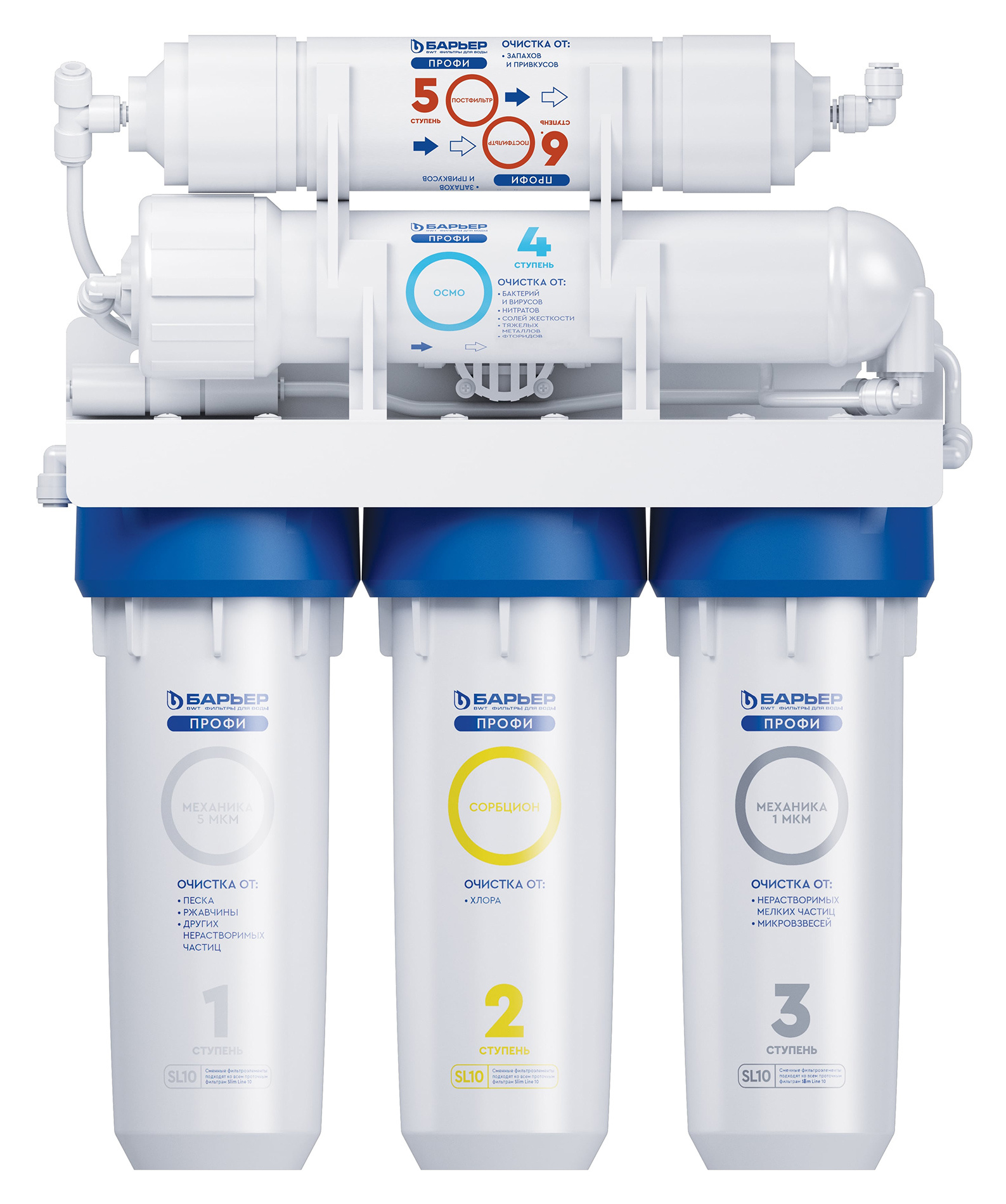 Фильтроэлемент Профи Механика 5 мкм, Фильтроэлемент ПРОФИ Сорбцион 2-я ступень, Фильтроэлемент Профи Механика 1 мкм, Фильтроэлемент ПРОФИ Осмо 100 (мембрана) 4-я ступень, Фильтроэлемент ПРОФИ Постфильтр 5-я ступень