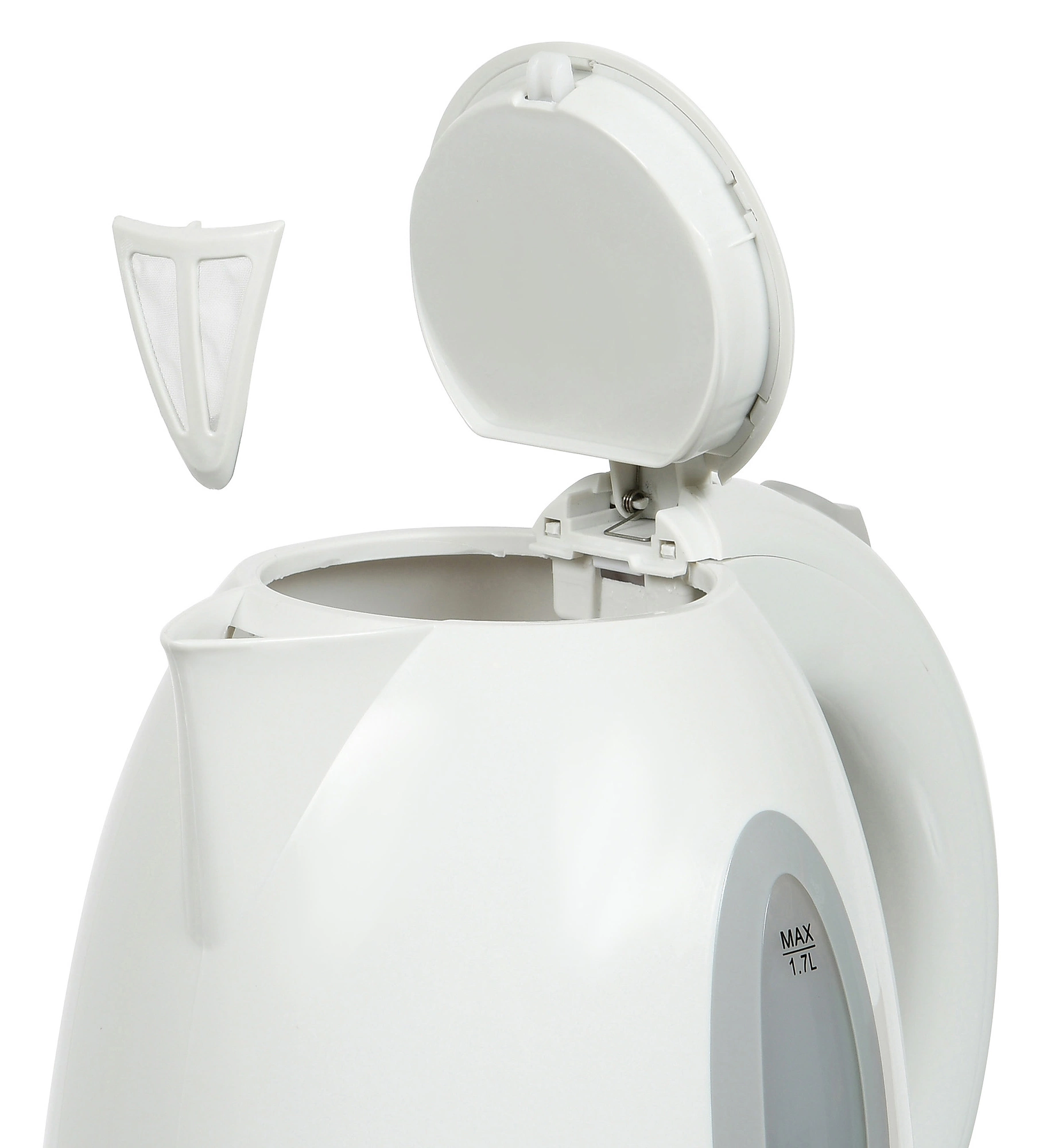 Среди преимуществ стоит отметить мощность прибора в 2200 Вт, благодаря чему даже заполненный по максимум чайник, а это 1700 мл, закипятит воду в считанные минуты. Нагревательный элемент скрыт под металлической пластиной, что упрощает уход за прибором, а также позволяет с легкостью очистить налет и накипь с поверхности. Для того, чтобы хлопья от некачественной воды не попали в напиток, на носике чайника установлена сетка-фильтр.