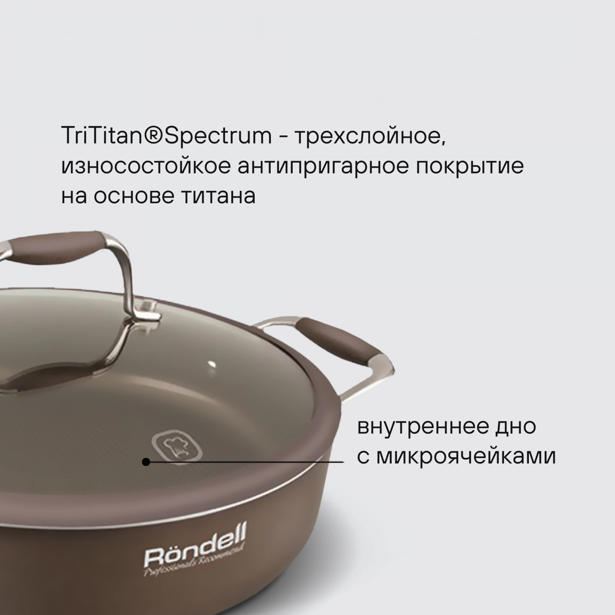 Внутреннее покрытие: TriTitan®Spectrum. Внешнее антипригарное покрытие. Аксессуары: удобные литые из нерж. стали с силиконовыми вставками. Силиконовый ободок крышки для бесшумного закрытия и предотвращения сколов; рельефная поверхность дна; возможно использование металлических лопаток.