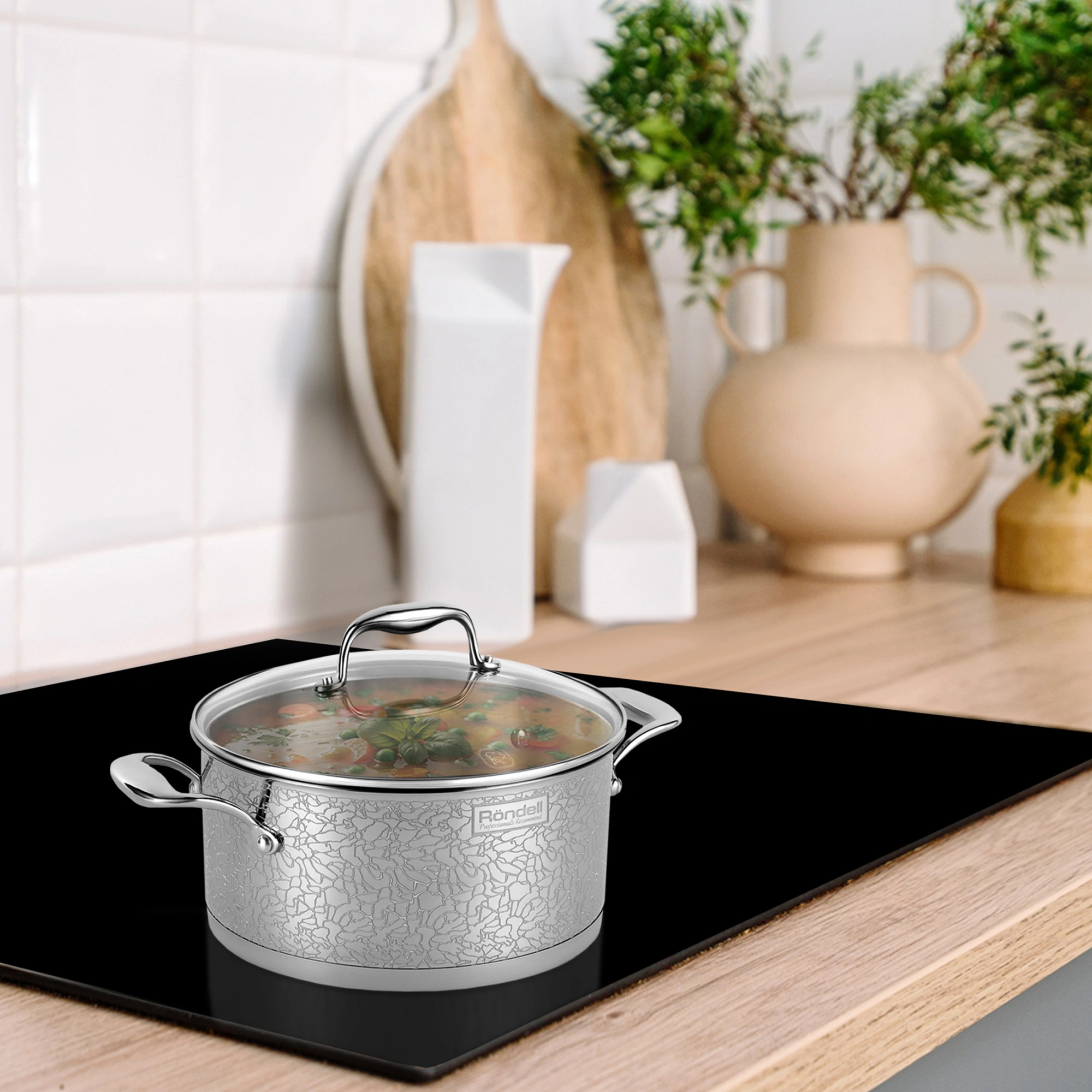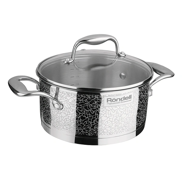 Материал: высококачественная нержавеющая сталь 18/10. Технология: тройное вштампованное, а затем вплавленное дно без воздушных полостей; жидкостекольная внешняя деколь. Материал крышки: термостойкое стекло и нержавеющая сталь. Аксессуары: литые из нержавеющей стали