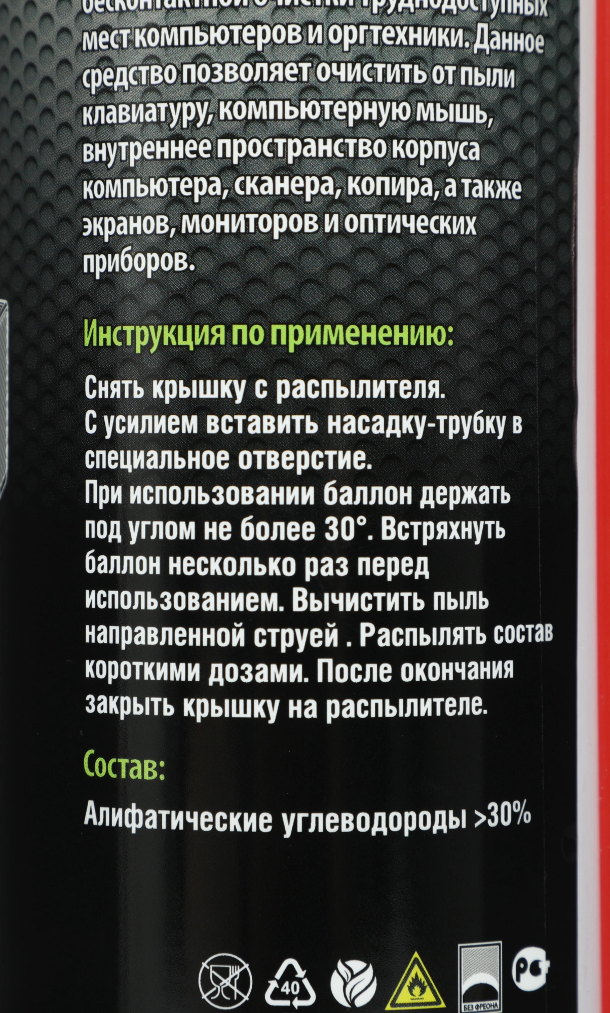 Очиститель высокого давления позволяет очистить от пыли клавиатуру, мышь, оптические приборы, экраны мониторов, труднодоступные места оргтехники.