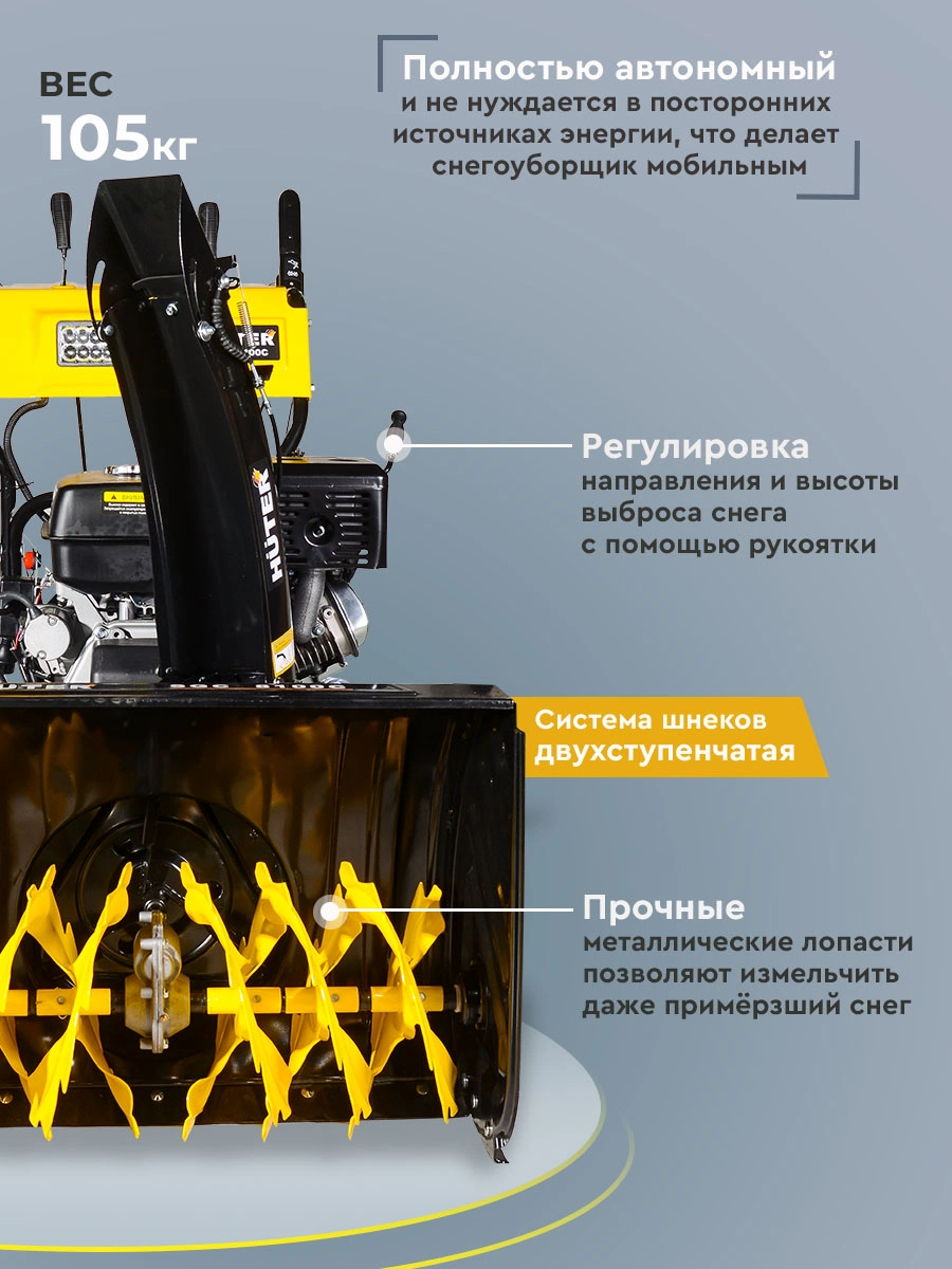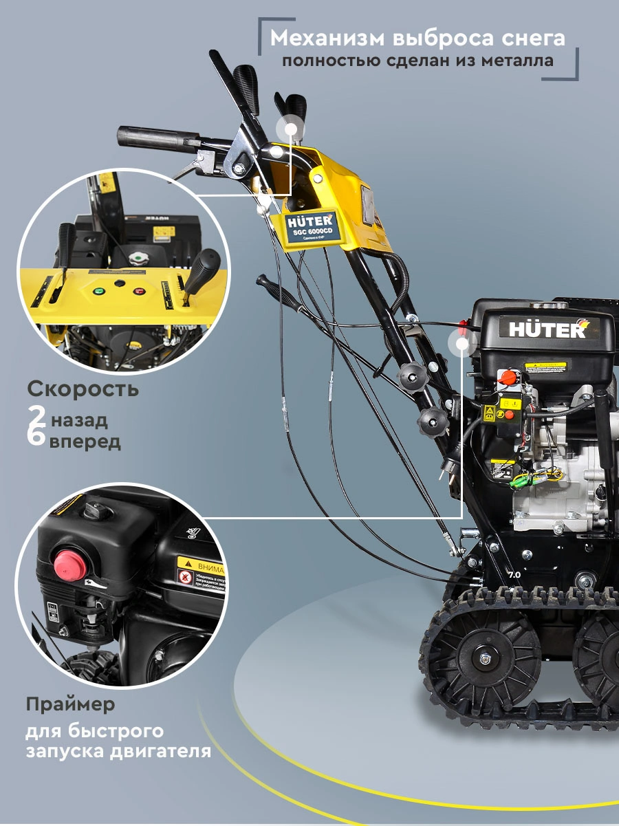 Бензиновый снегоуборщик Huter SGC 8100C обладает проходимостью гусеничного вездехода. Разгрузочный желоб легко повернуть с помощью специального рычага. Широкий диапазон скоростей позволяет выбрать наиболее удобный для оператора темп работы. Ограничительные полозья предотвращают повреждение ковша.