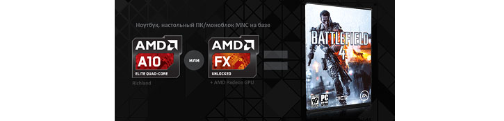 Компания AMD в партнерстве с Battlefield 4™ проводит акцию для конечных пользователей. При покупке определенных моделей ноутбуков и настольных ПК HP и Acer на базе процессоров AMD, покупатель получает подарок - игру BattleField 4™.