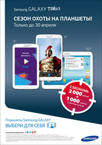 Сообщаем о старте дополнительной акции Samsung для конечных покупателей, которая проходит в рамках акции «Сезон охоты на планшеты». Теперь, при покупке планшета Samsung GALAXY Tab 3, помимо экономии в размере 2 000 рублей, покупатель получает также возможность просмотра и/или загрузки фильмов, доступных в Сервисе Play, на сумму 1000 рублей*!