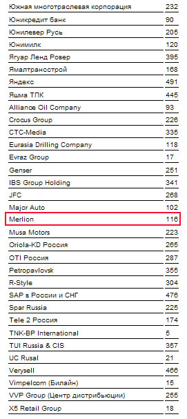 В рейтинге «Финанс.» «500 крупнейших компаний России» MERLION занимает 116-е место. Основным ранжирующим показателем рейтинга является выручка - наиболее эффективный показатель масштаба бизнеса компании. Подробнее о результатах - в журнале «Финанс.» (№35, 27.09.2010г.).