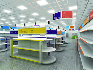 Внутри торгового зала каждая товарная группа выделена через цвет вывески отдела, витрины, стеллажей, ценников, информационных табличек – всего оборудования, вплоть до вертикальных разделительных стоек. Цвет товарной категории также будет продублирован на сайте, в рекламе, в каталогах и т.д.