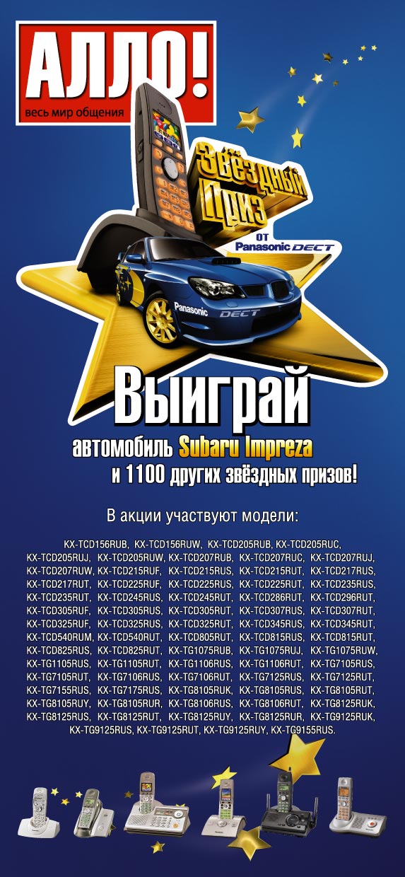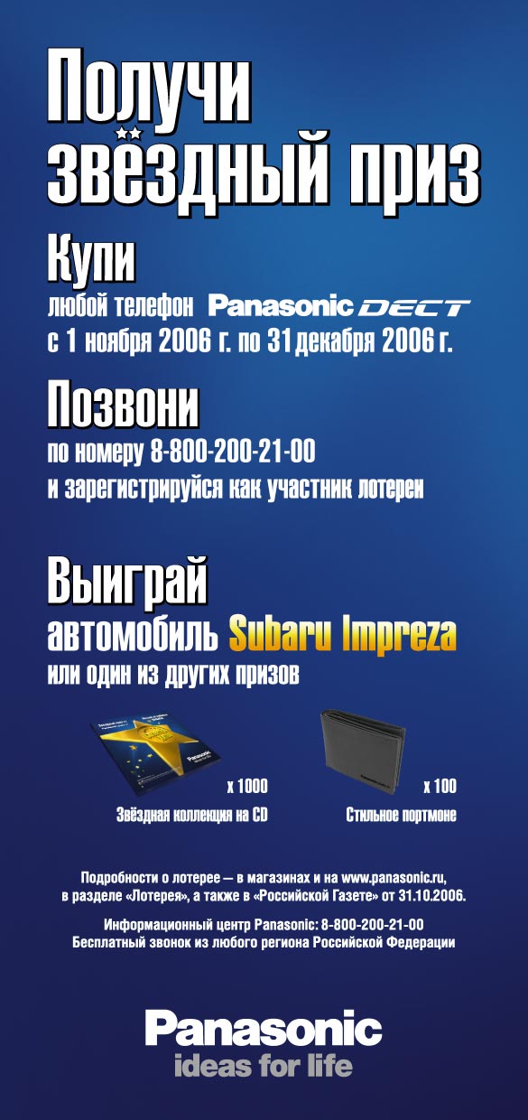 При покупке любого телефона Panasonic DECT, покупатель может зарегистрироваться по бесплатному телефону в контакт центре Panasonic (8 800 200 2100) и стать участником лотерии.