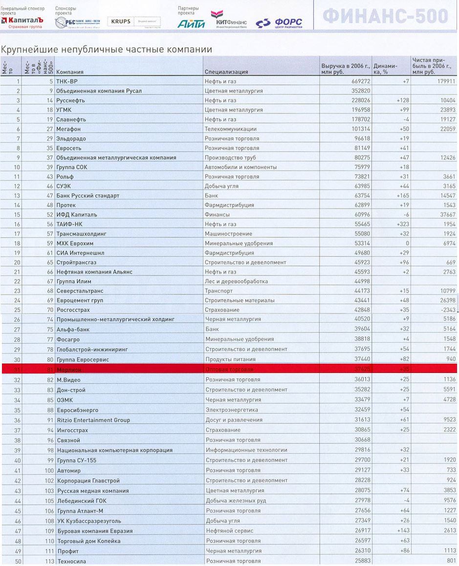 24-30 сентября 2007) компания MERLION занимает 81-е место (+1 по сравнению с предыдущим годом). В дополнительном рейтинге «+50 в тени – Крупнейшие непубличные частные компании» MERLION занимает 31-е место.